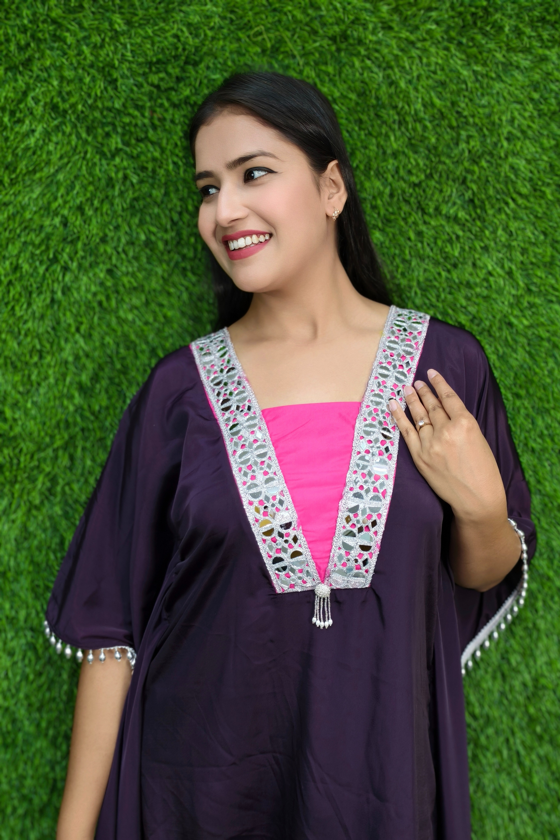 - Design: Beautiful Indo-Western V-neck style kaftan set with intricate mirror work in pure Kareeb fabric with bottom pants and beadwork detailing over the edges of the kaftan