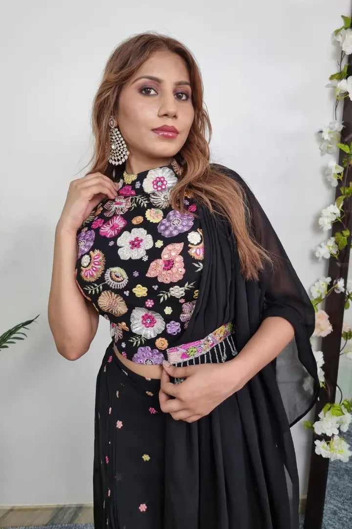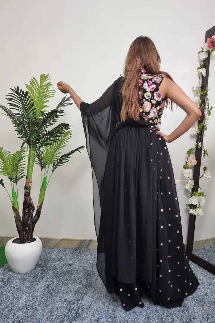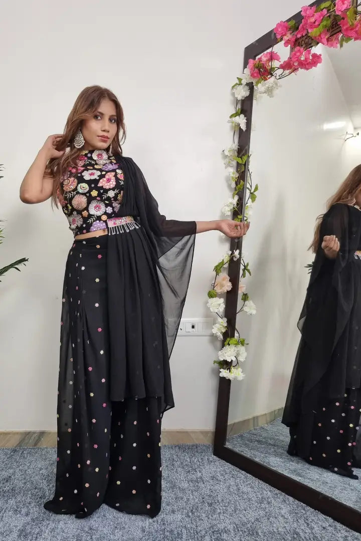 Floral Embroidery Crop Top Sharara With Attached Drape in Black