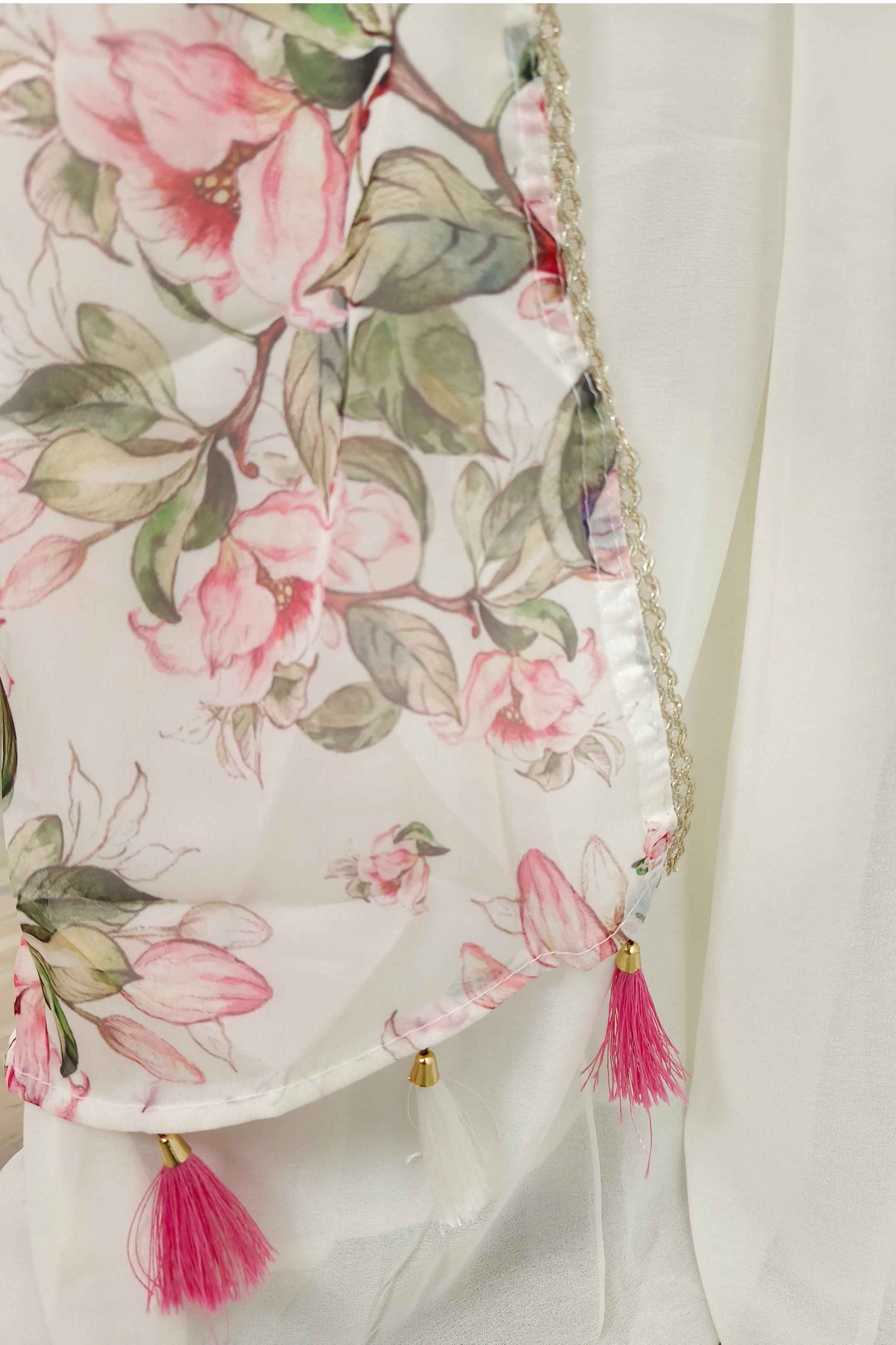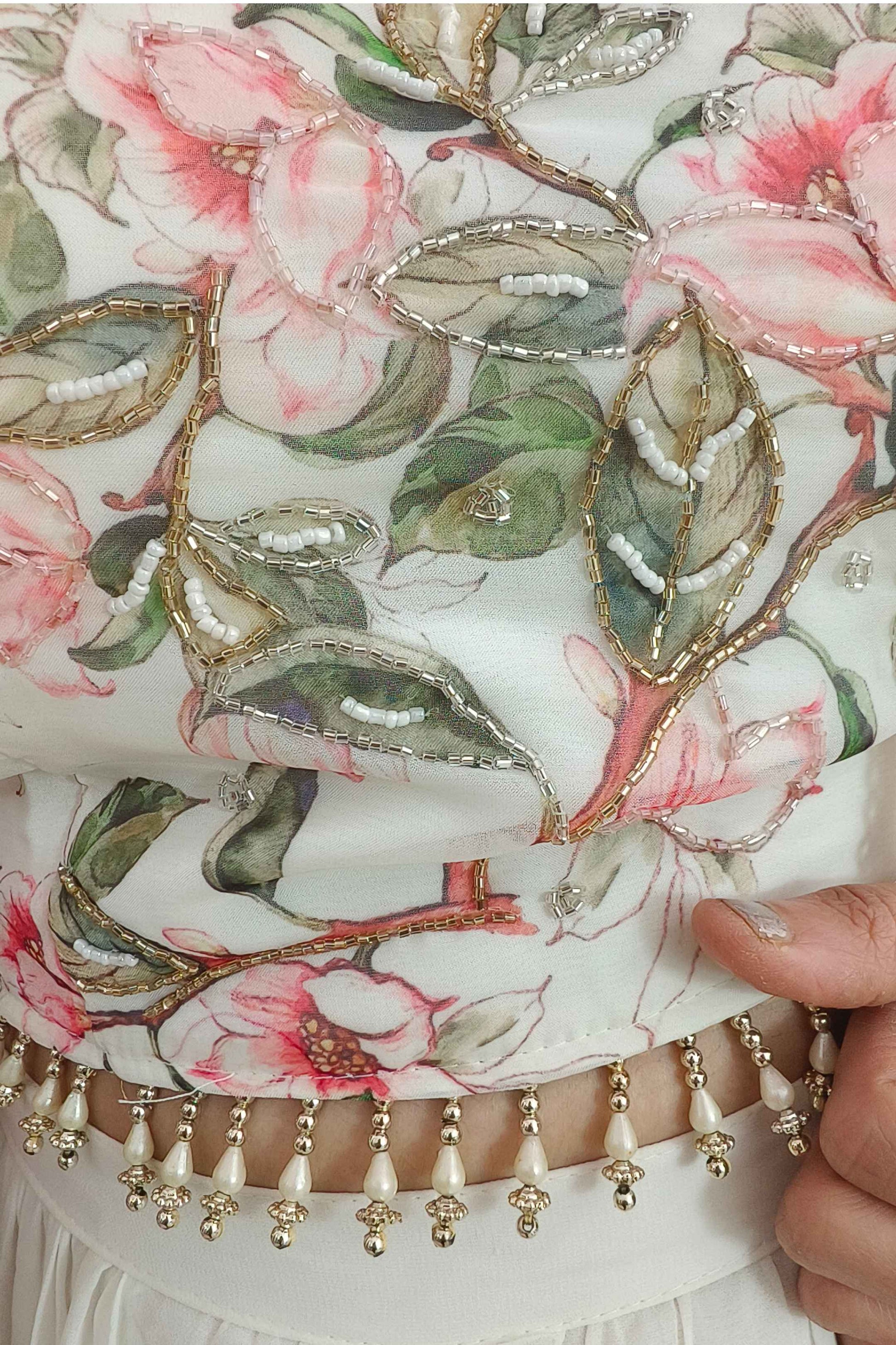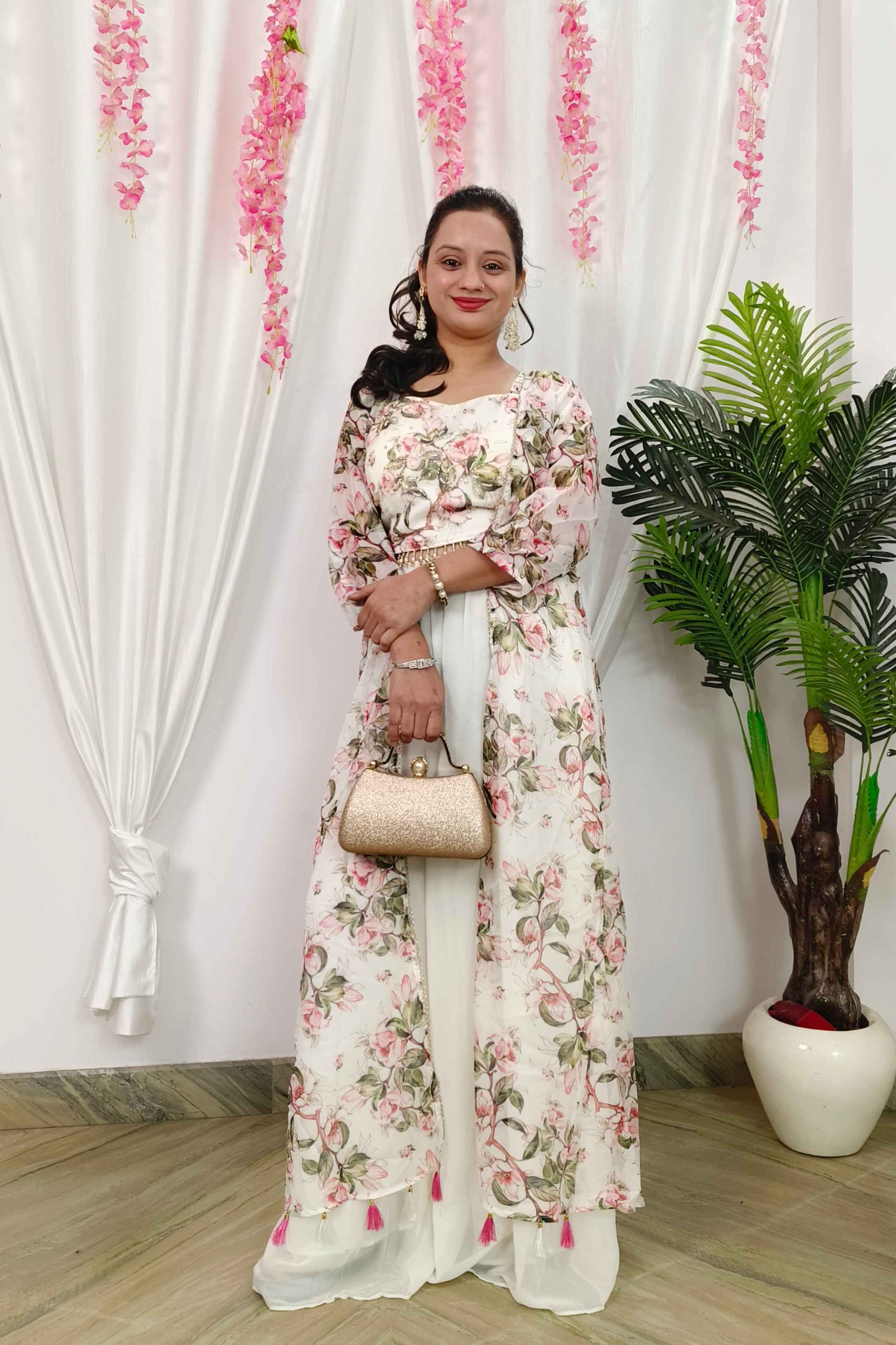 Georgette Indo Western 3 piece Dress With Organza Printed Shrug in Off white