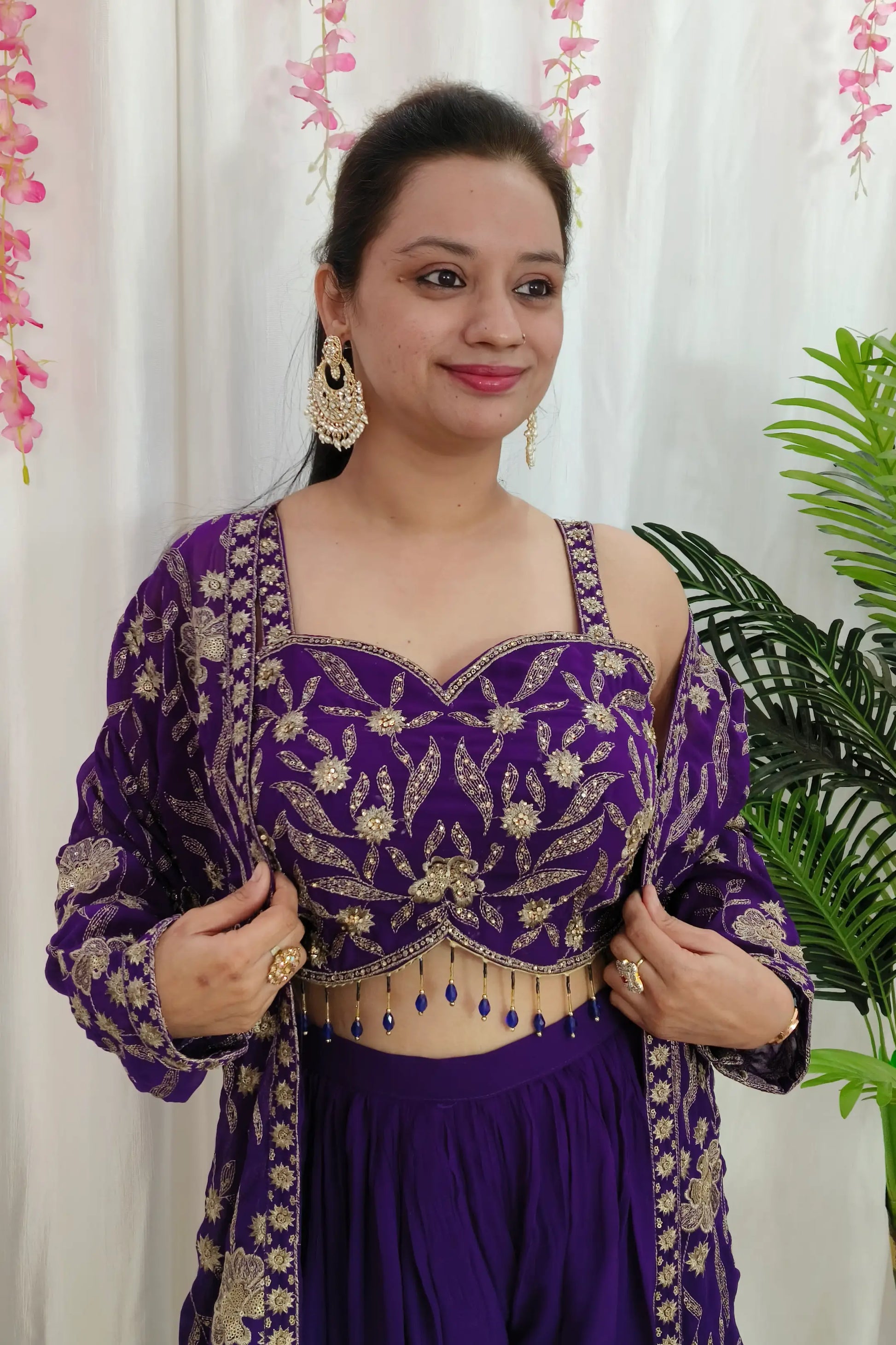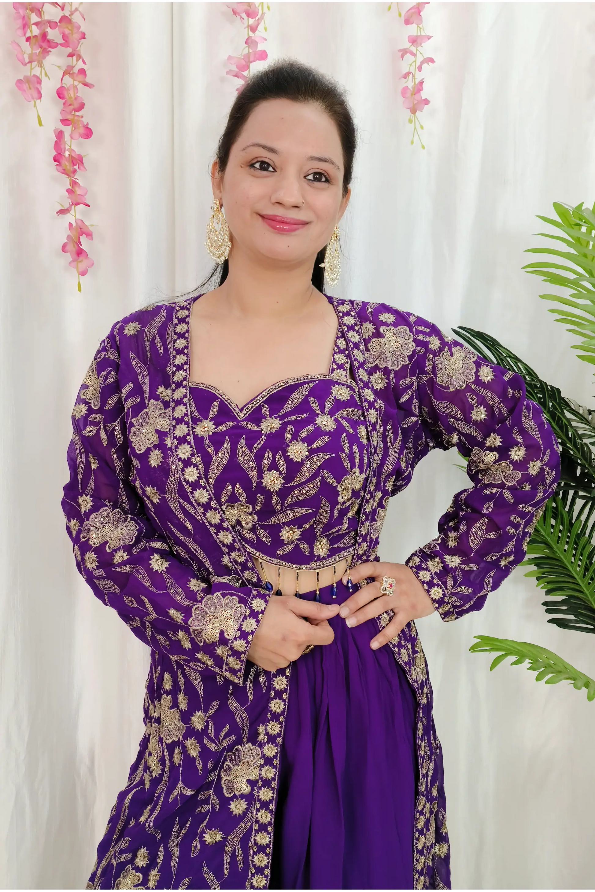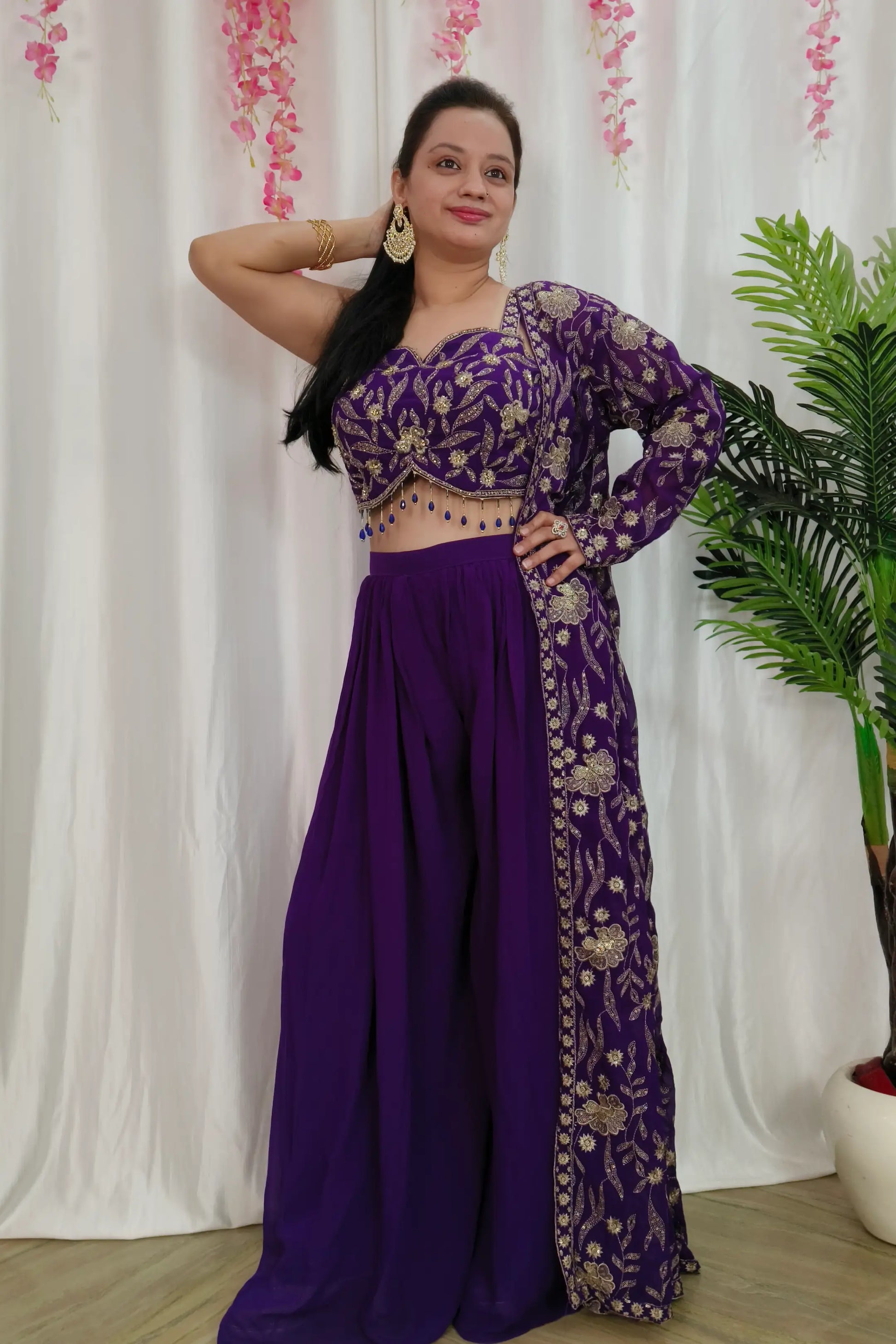 Georgette Indowestern Partywear 3 Piece Dress With Zari Work Embroidery In Purple