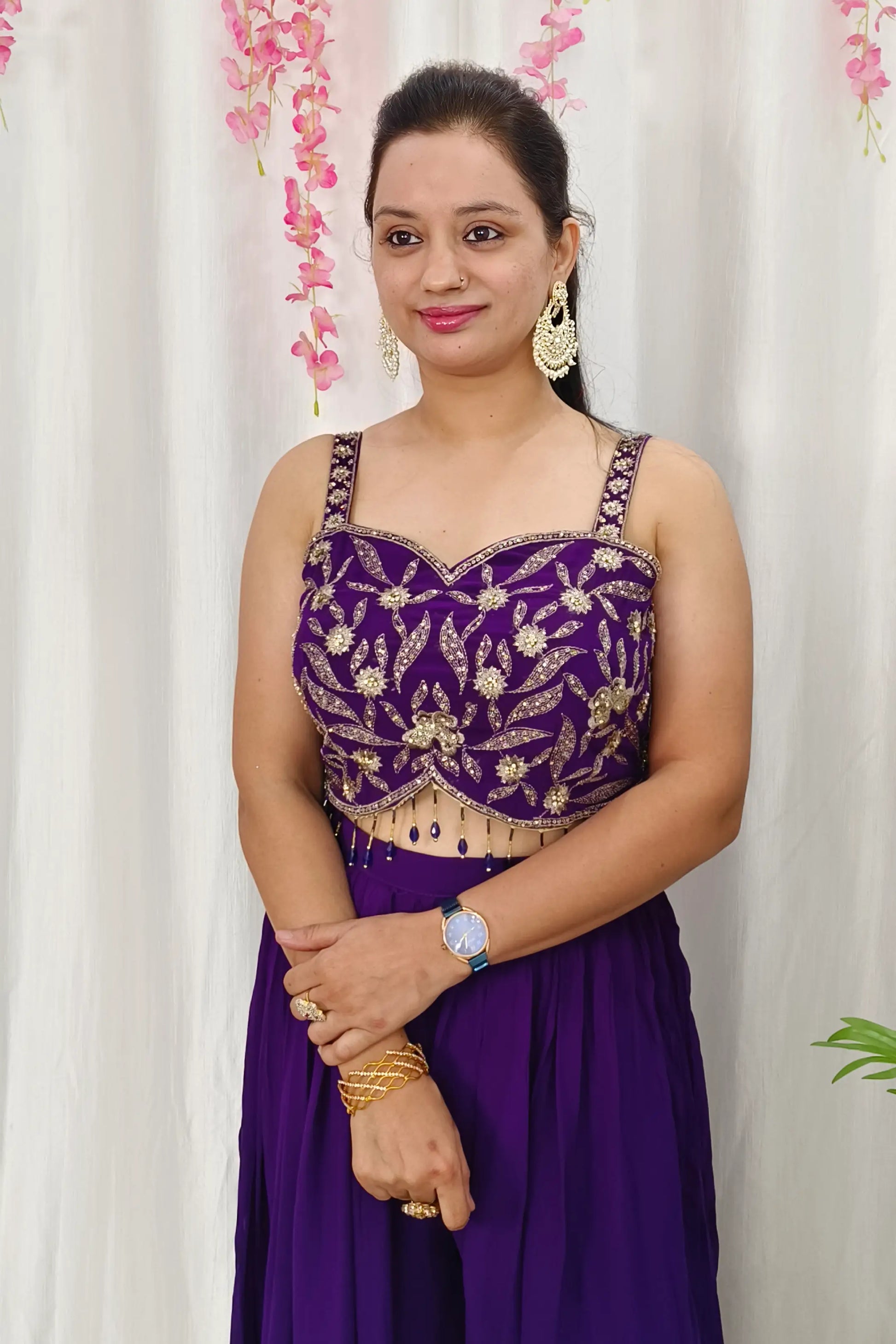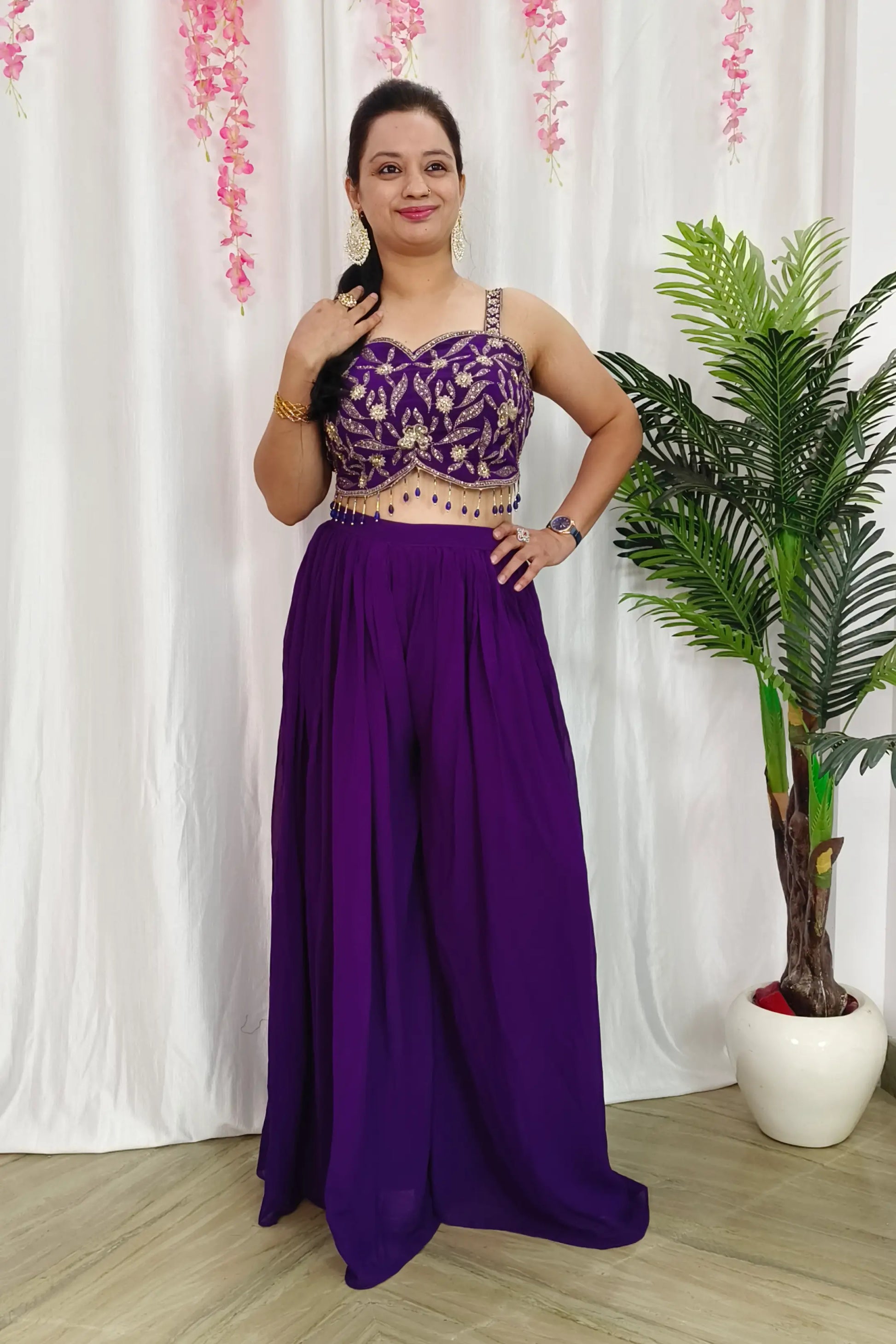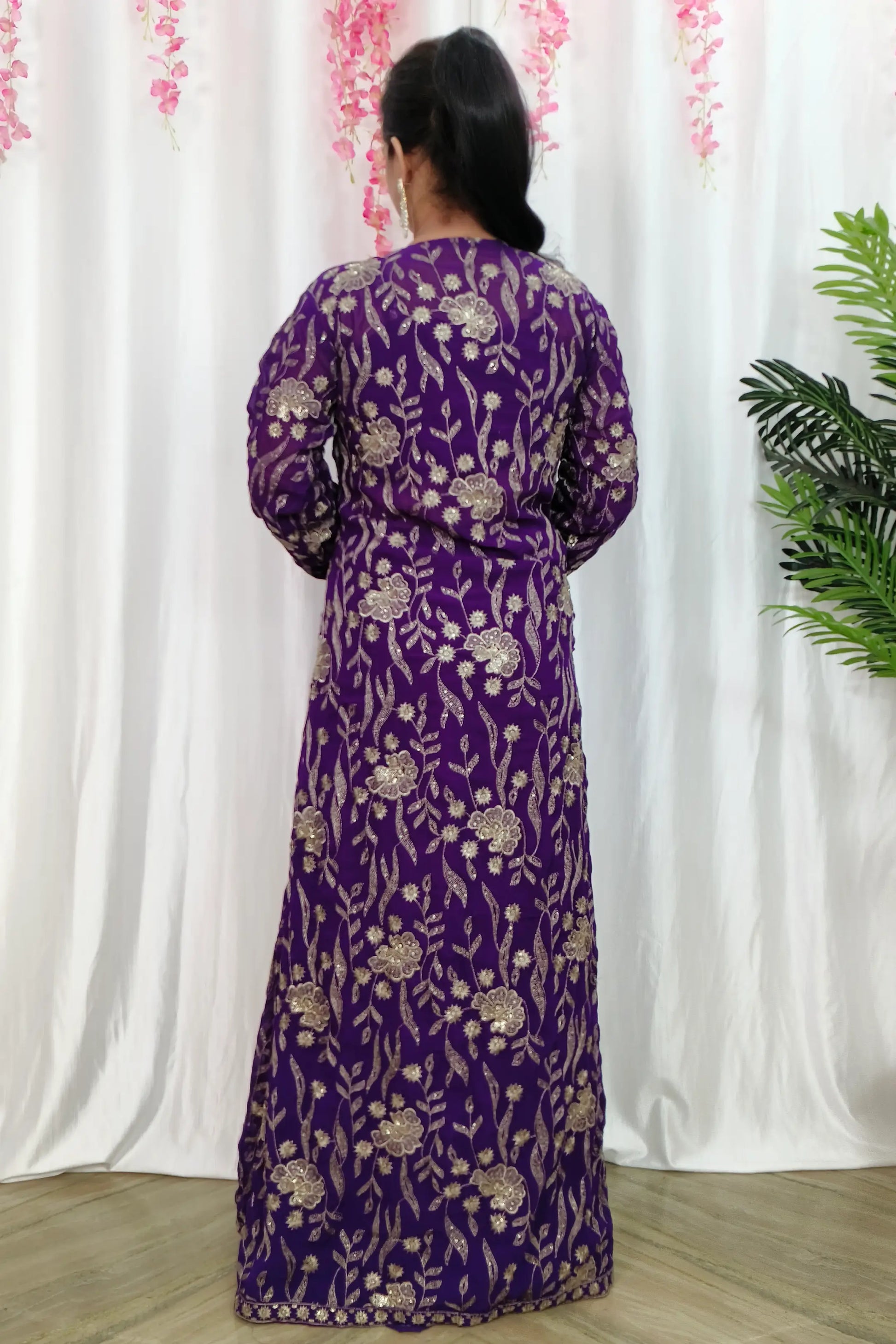Georgette Indowestern Partywear 3 Piece Dress With Zari Work Embroidery In Purple
