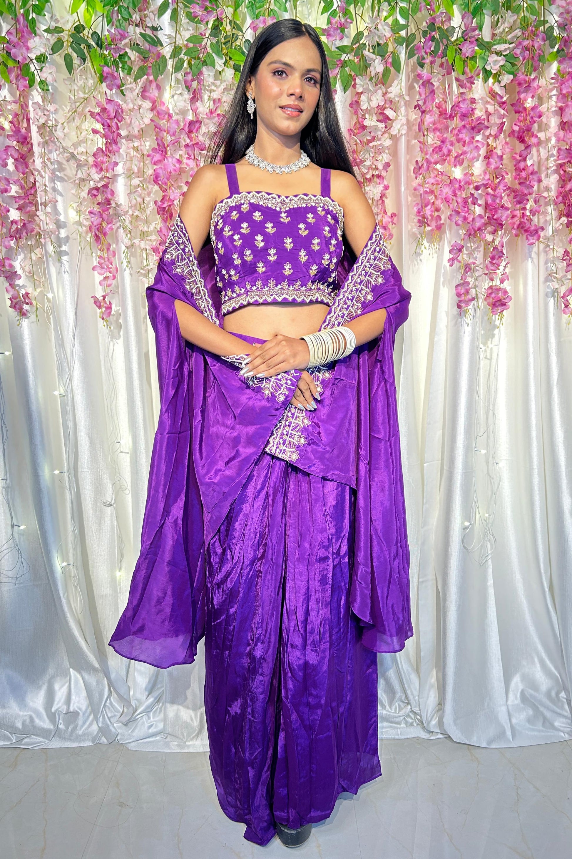 - Chic Indo Western Ensemble: This set includes a stylish Indo Western dress with a matching shrug, crafted from pure viscose chinon fabric in a lovely purple hue.