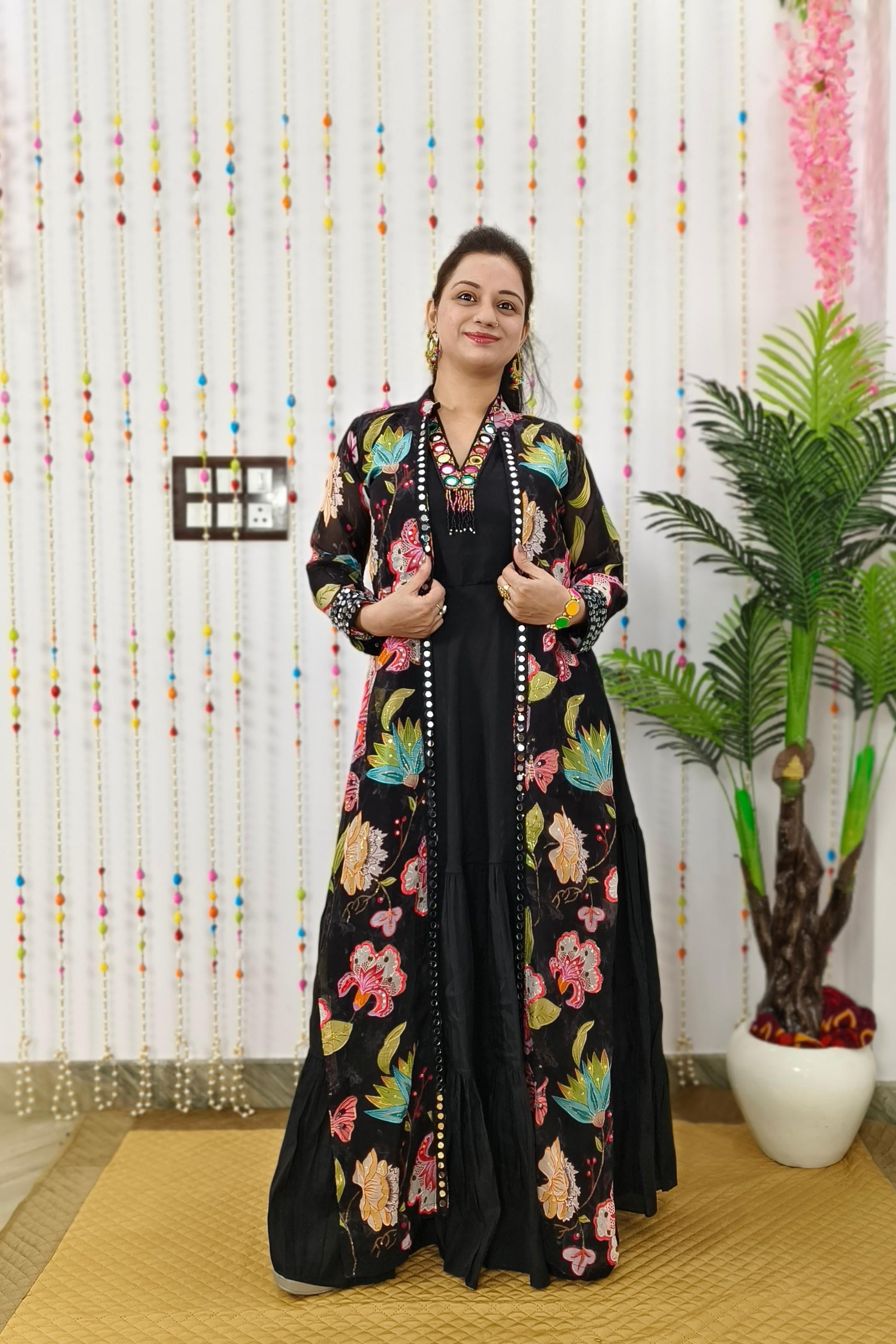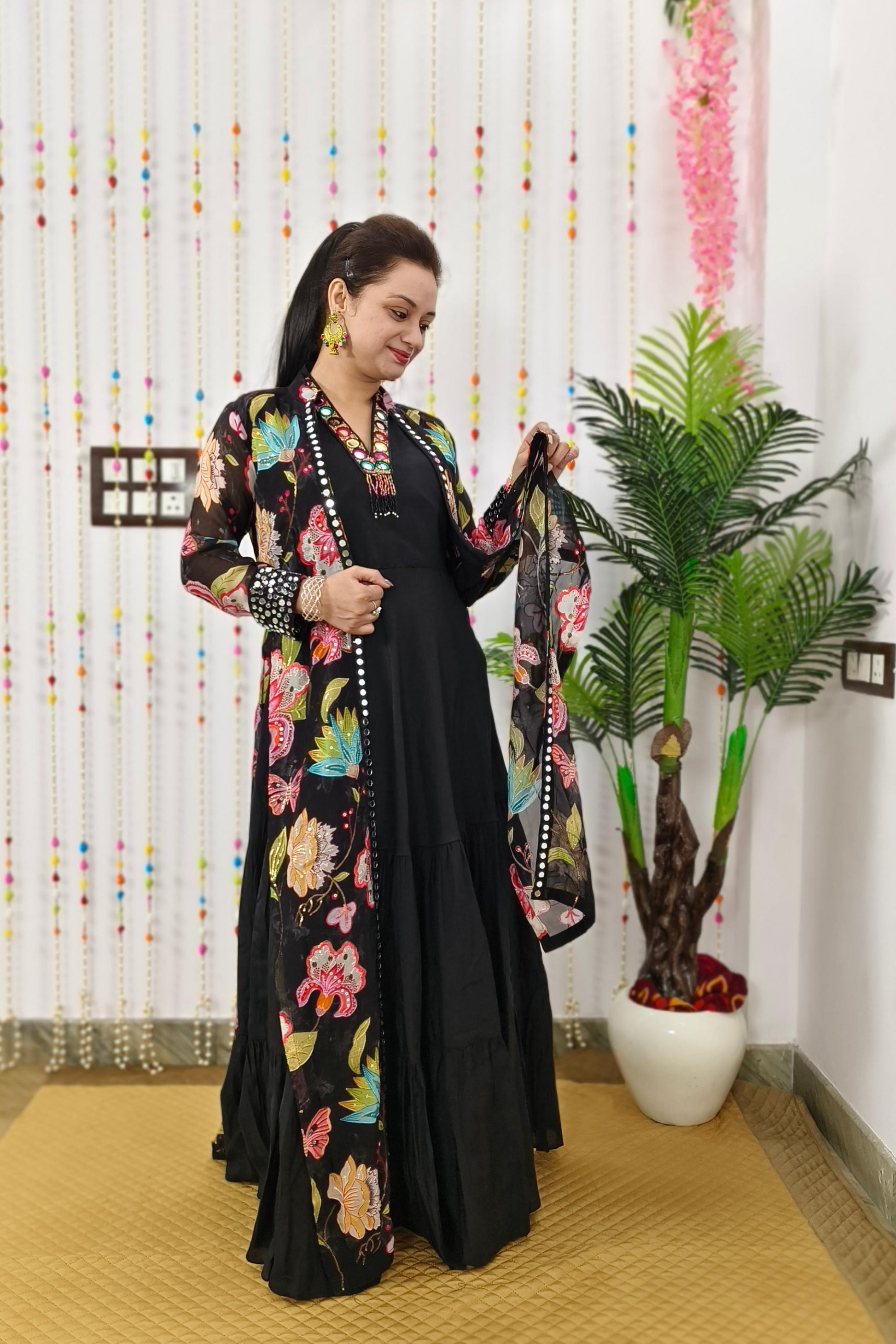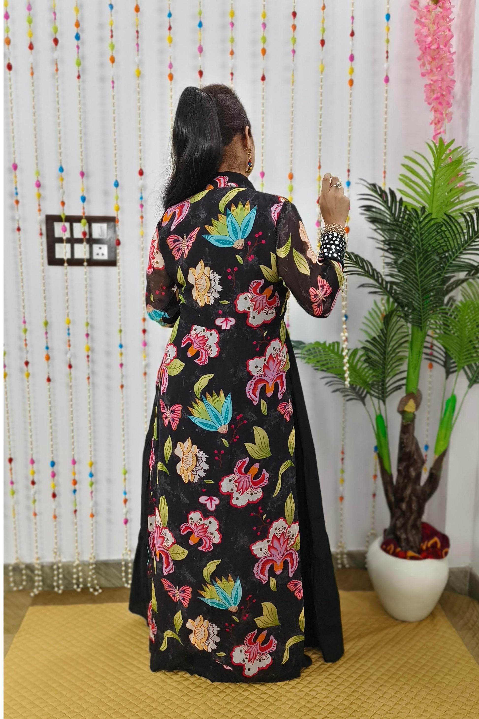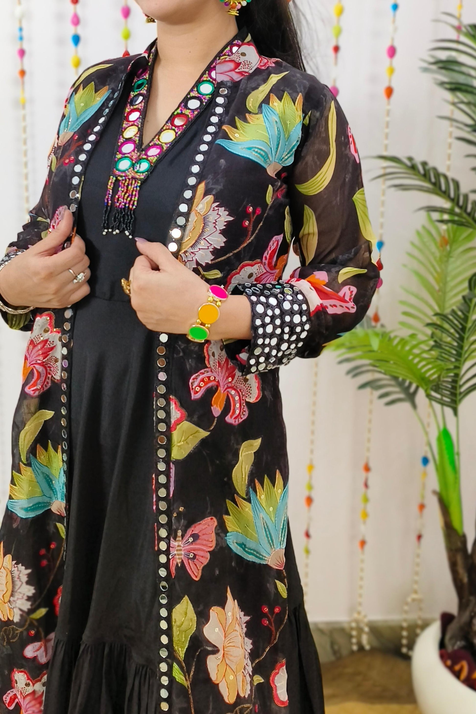 Indo Western One Piece Dress With Long Over shrug In Floral Black