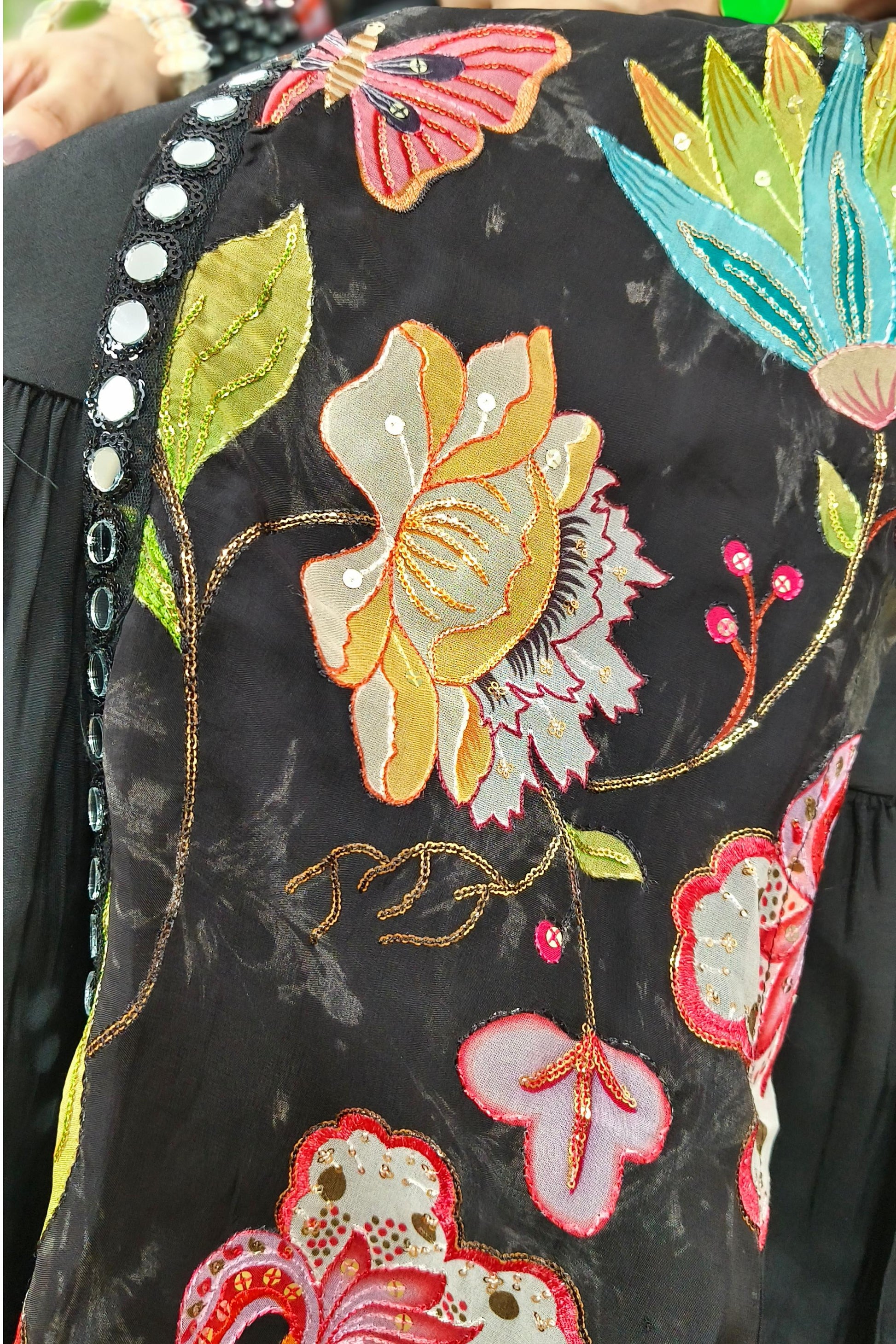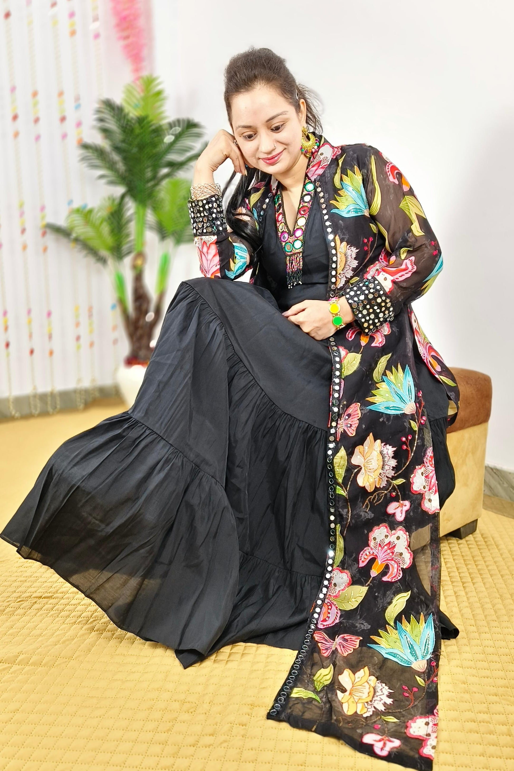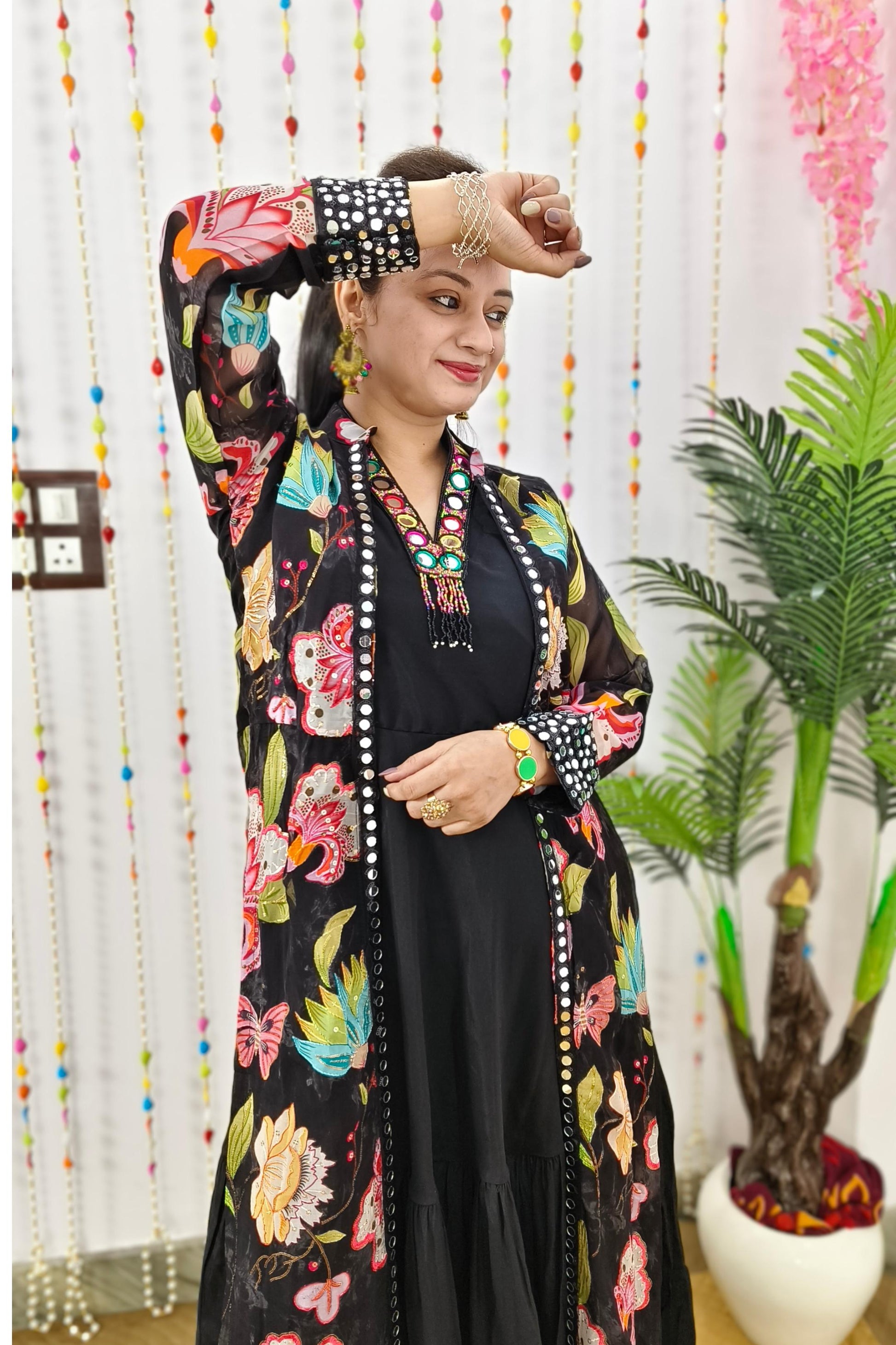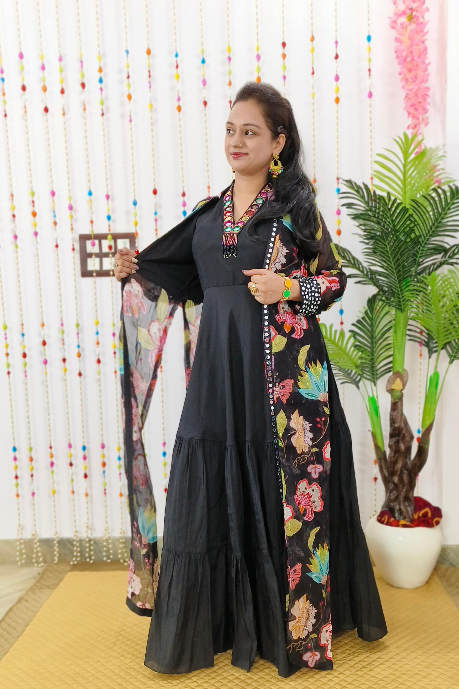 Indo Western One Piece Dress With Long Over shrug In Floral Black