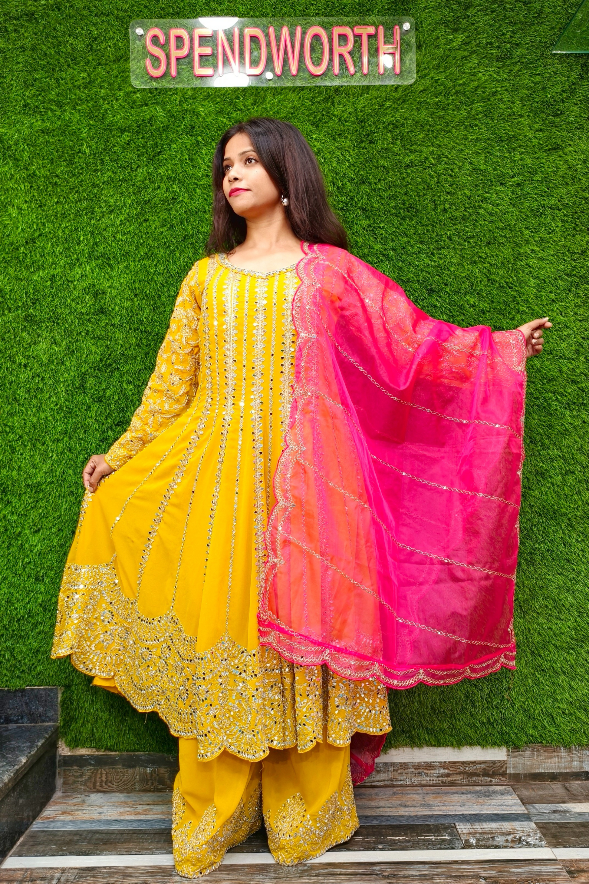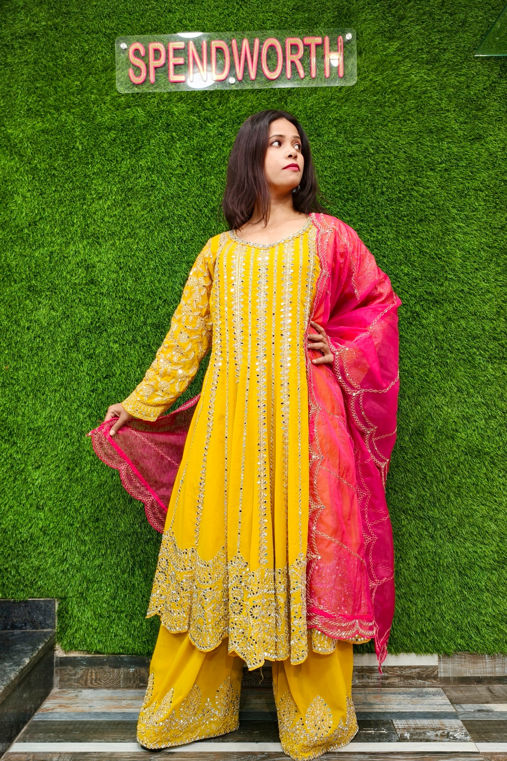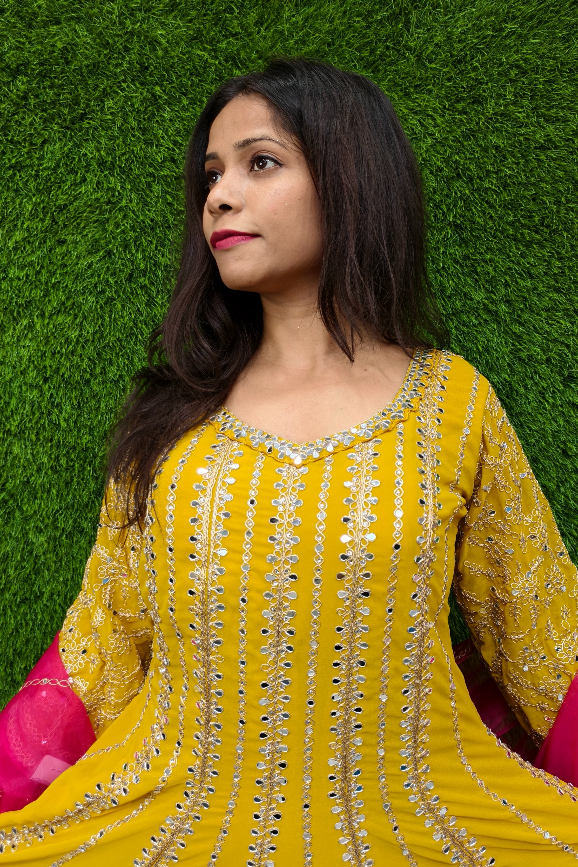 - Description : Beautiful long Anarkali suit with mirror work detailing, paired with matching mirror-embroidered plazo bottom. It is accompanied by a stunning contrast embroidered organza dupatta, adding a graceful charm.
