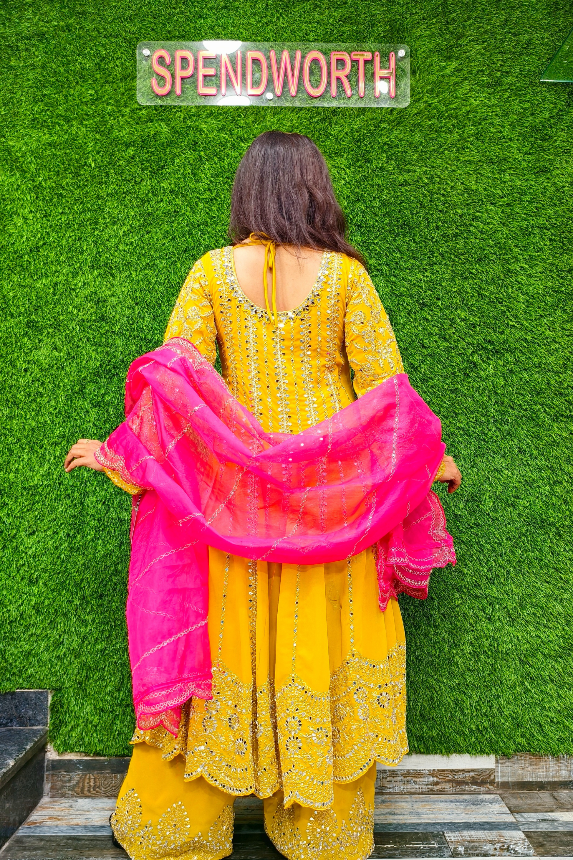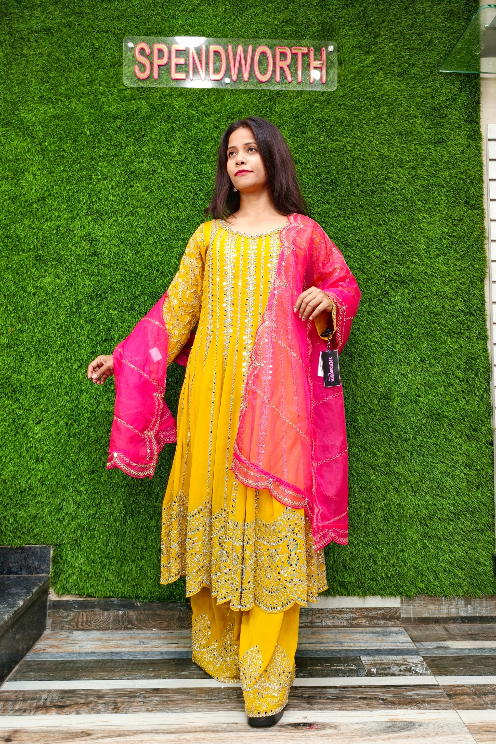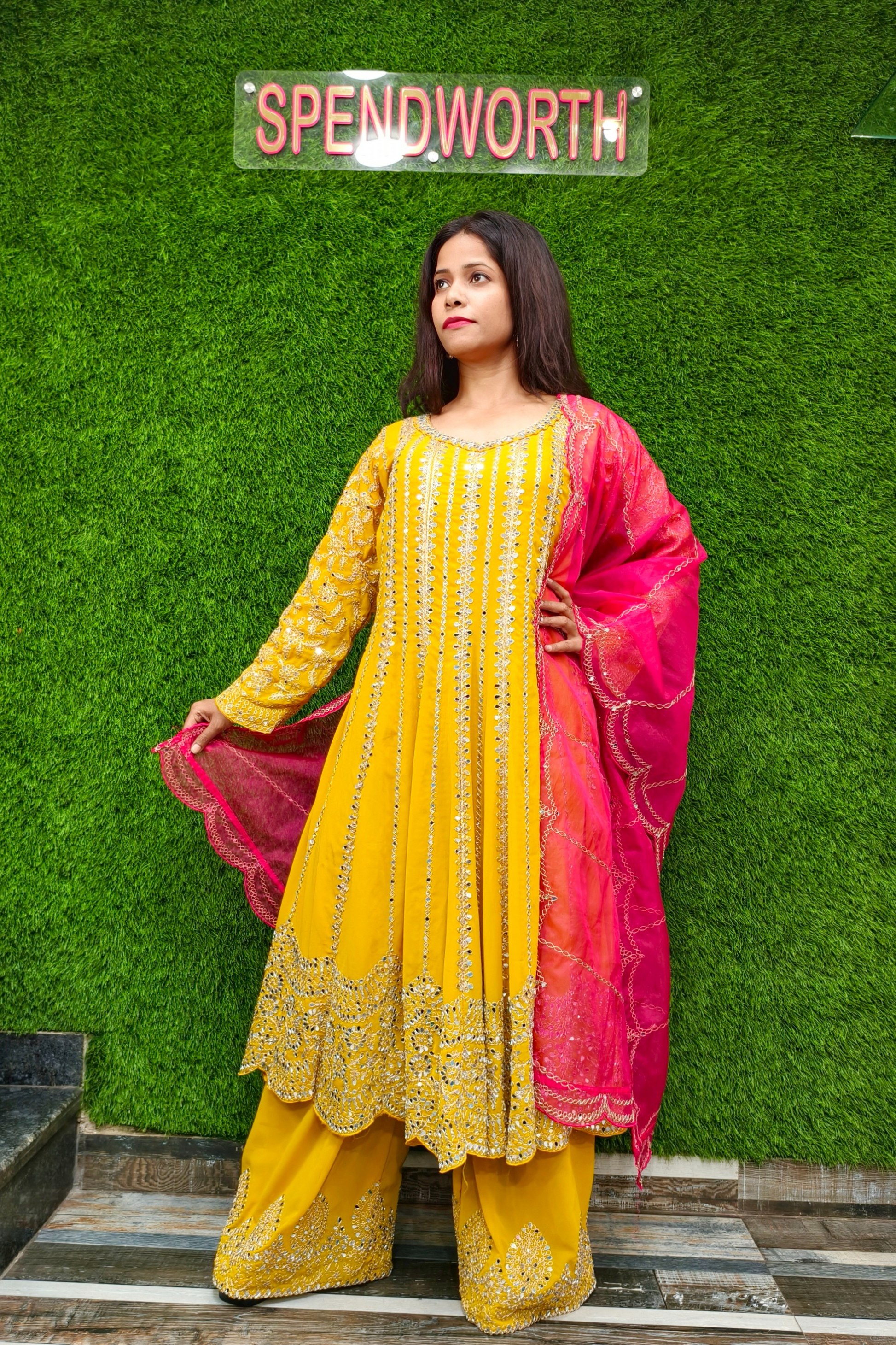 - Description : Beautiful long Anarkali suit with mirror work detailing, paired with matching mirror-embroidered plazo bottom. It is accompanied by a stunning contrast embroidered organza dupatta, adding a graceful charm.