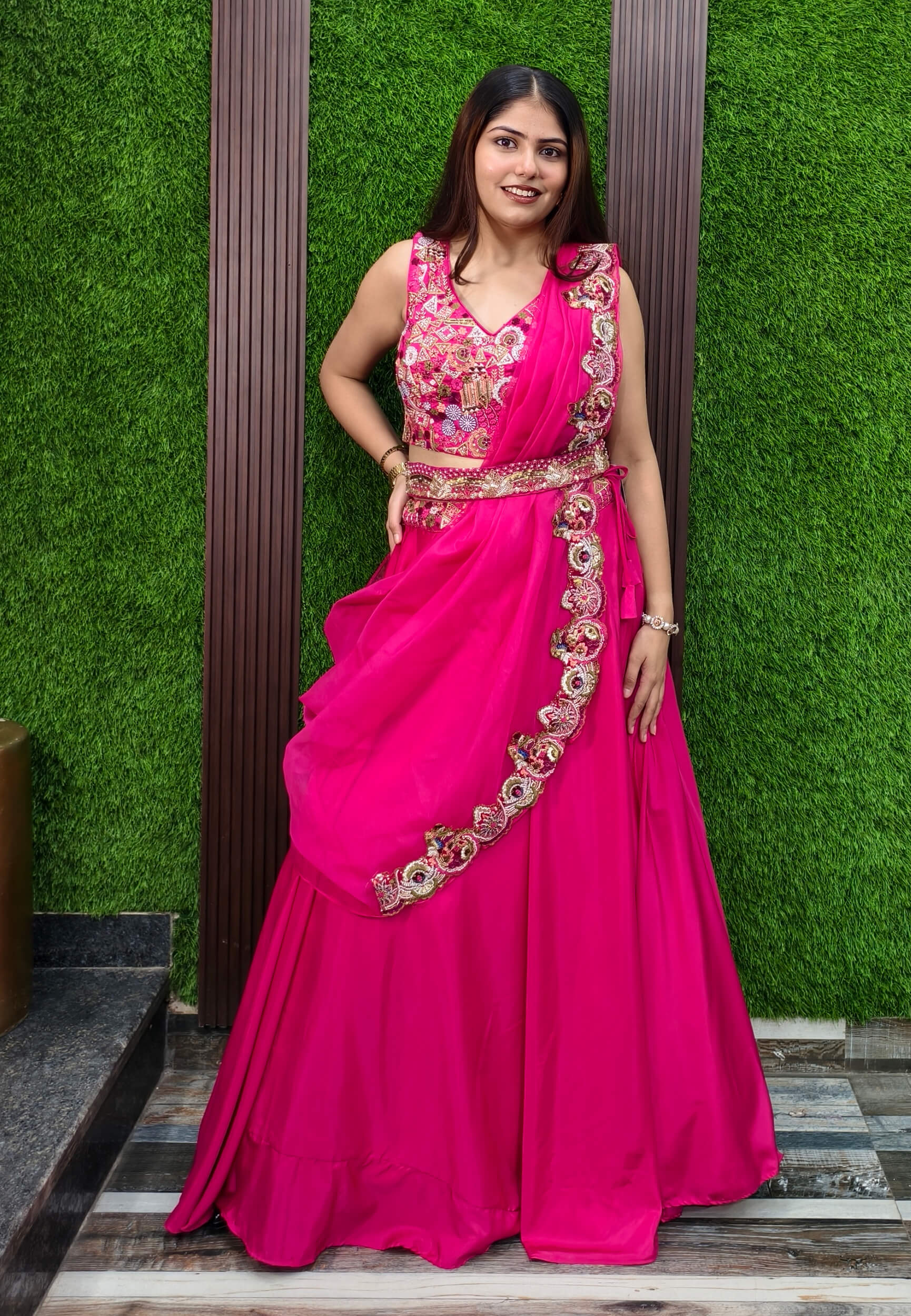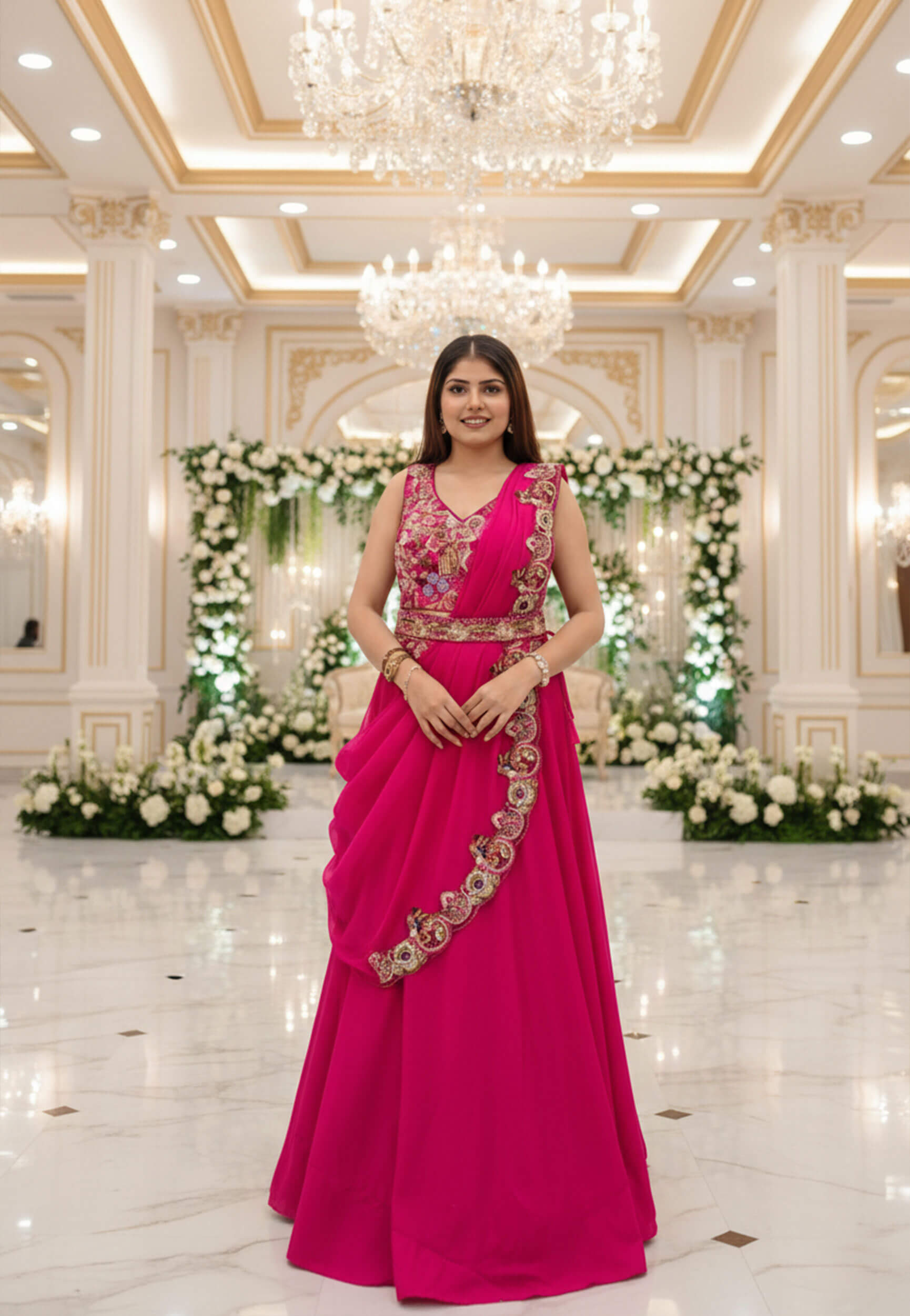 This Multi Embroidered Indo Western Dress with Belt and Separate Designer Cape is a stylish and elegant outfit perfect for special occasions. Made from soft georgette fabric, it feels light and comfortable, while the organza cape adds a classy and trendy touch. The detailed thread work embroidery makes the dress look rich and attractive. It also comes with a matching belt that enhances your shape and completes the look. This outfit is perfect for parties, weddings, and festive events.