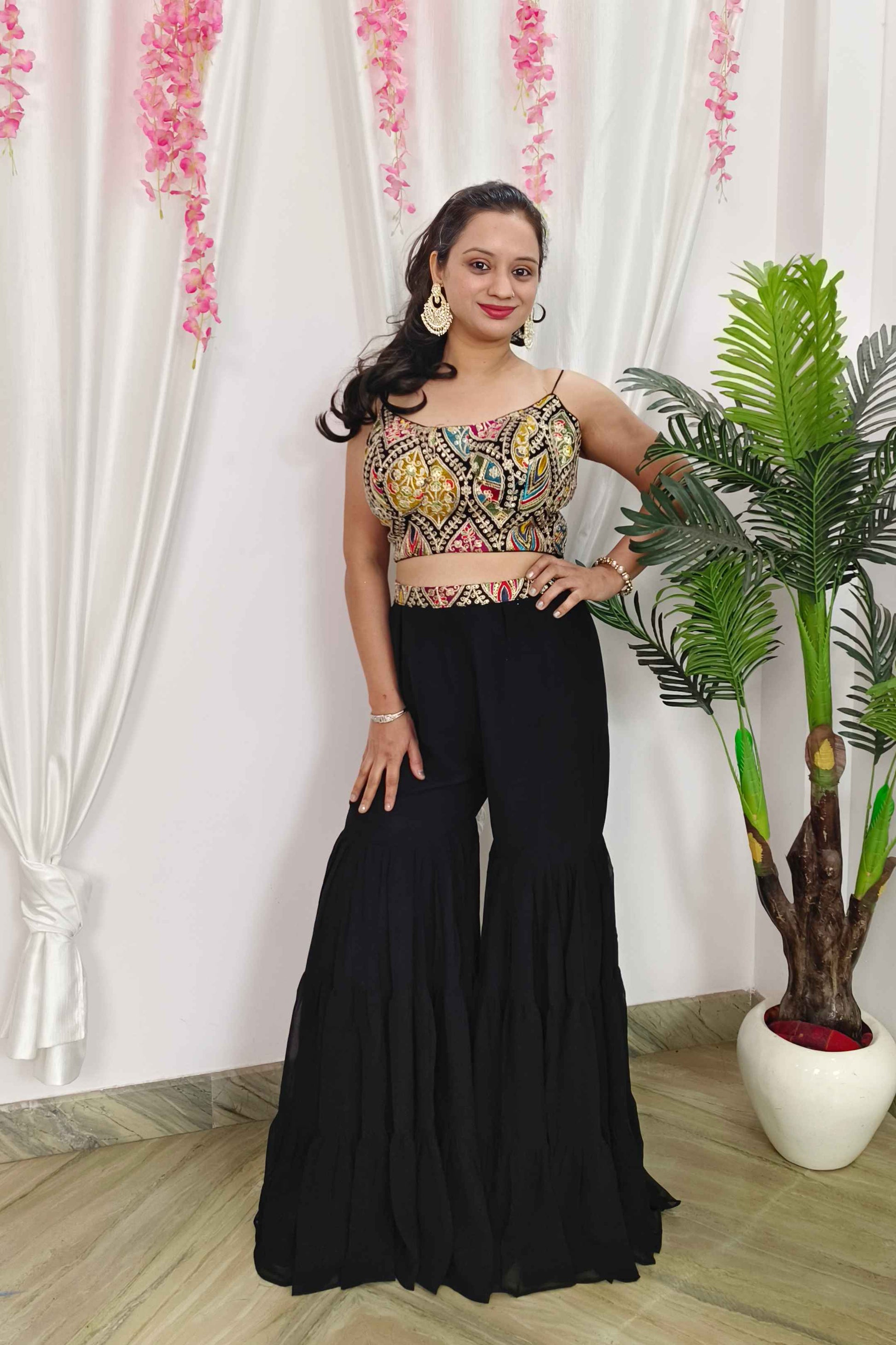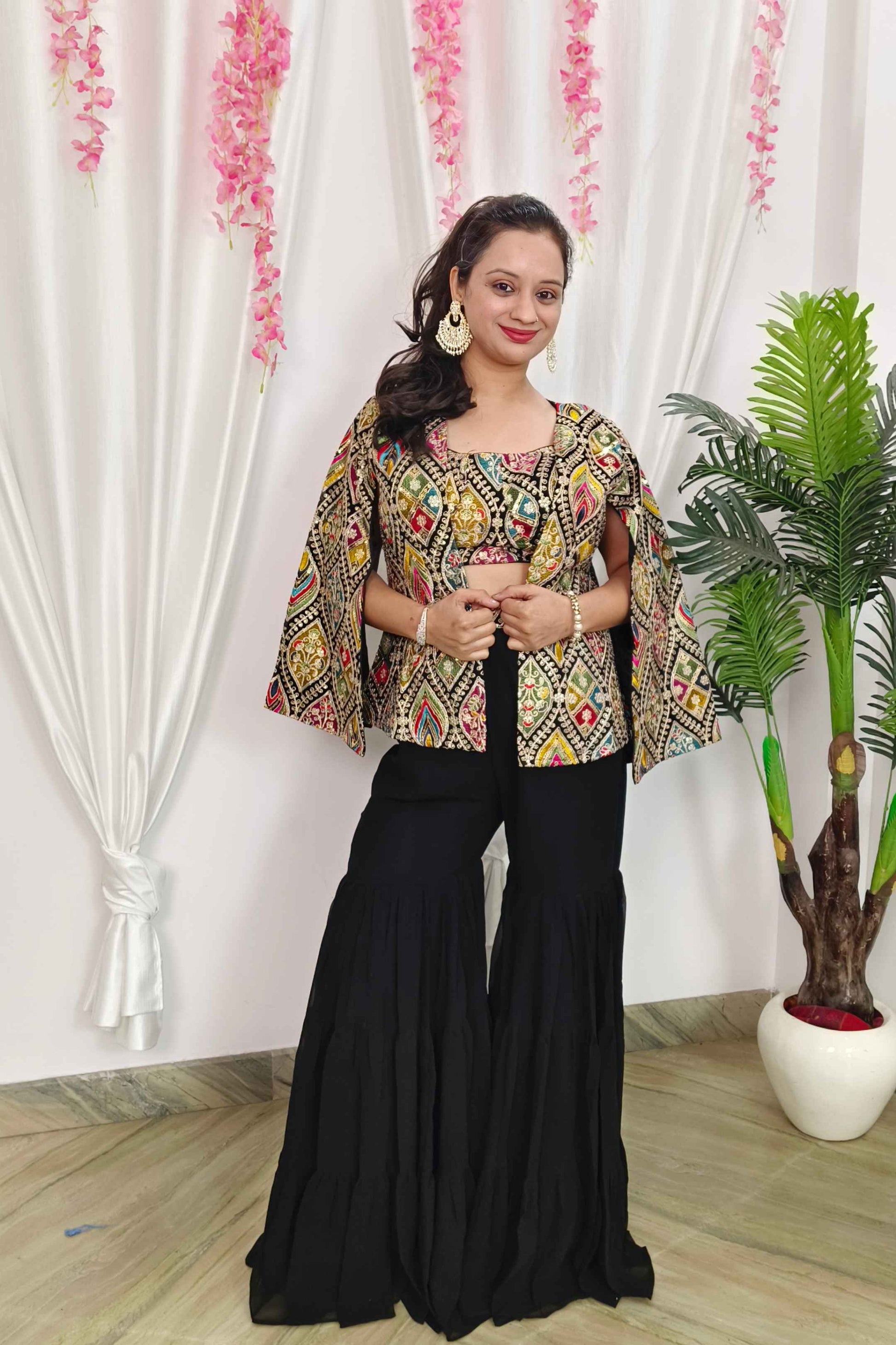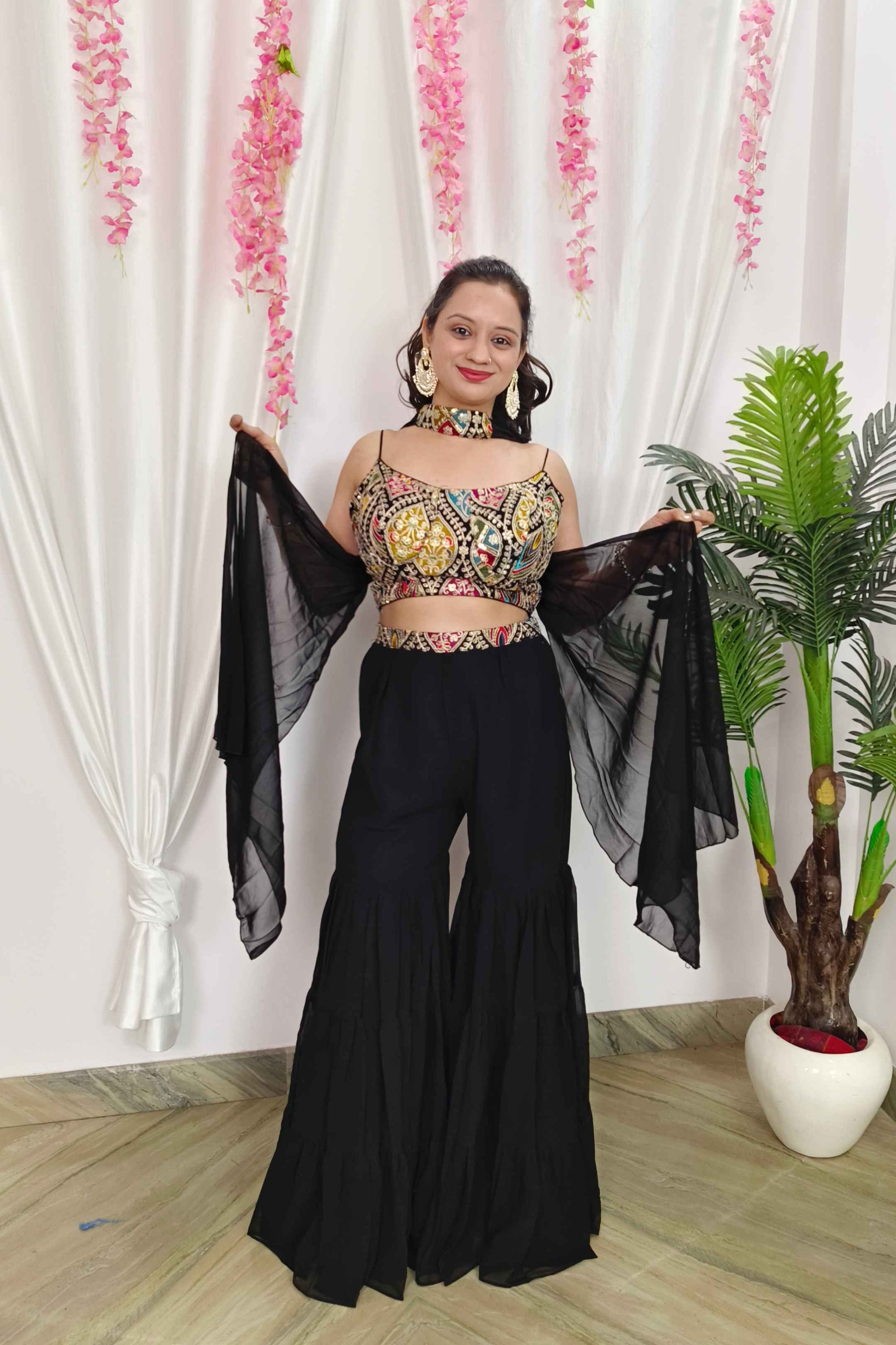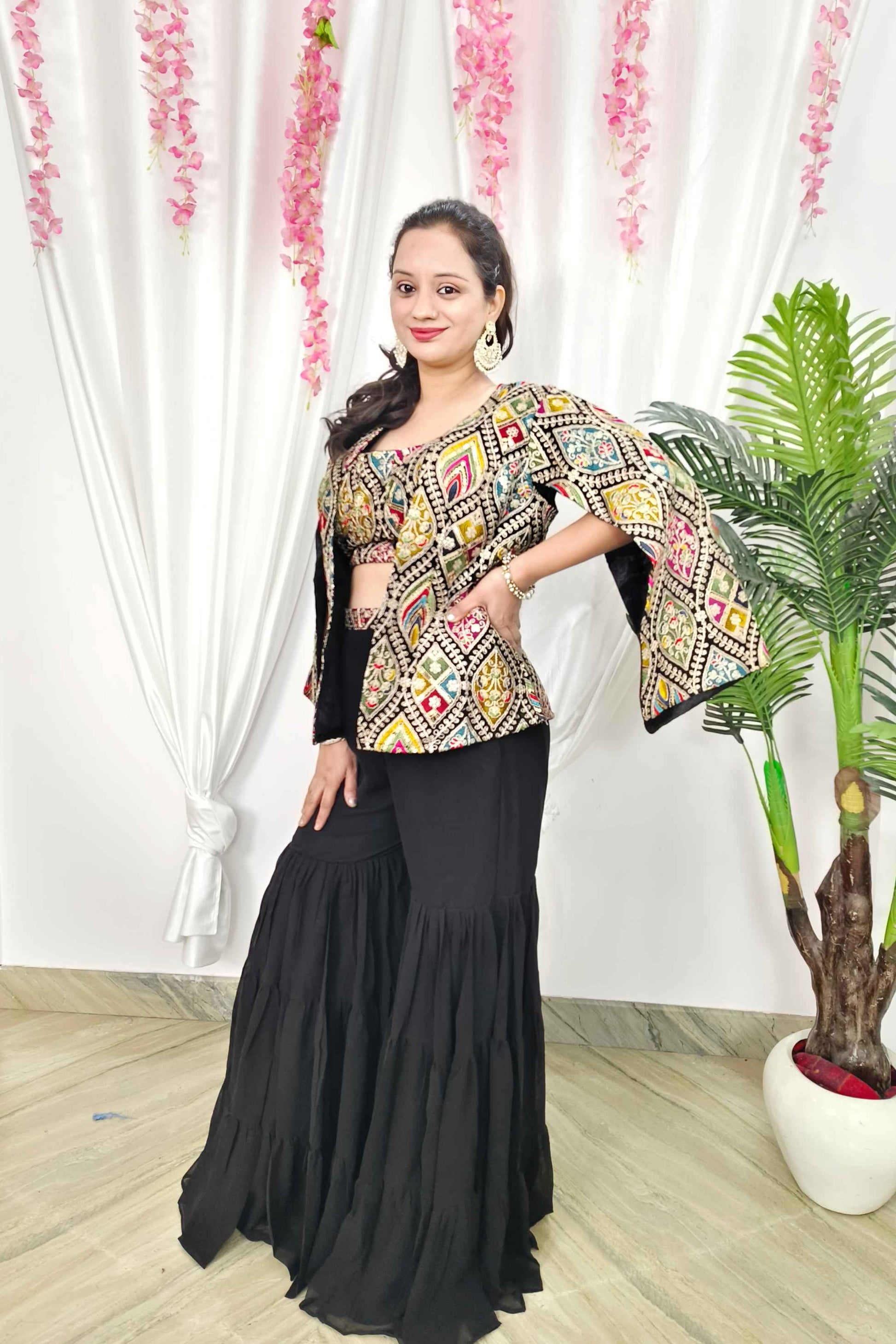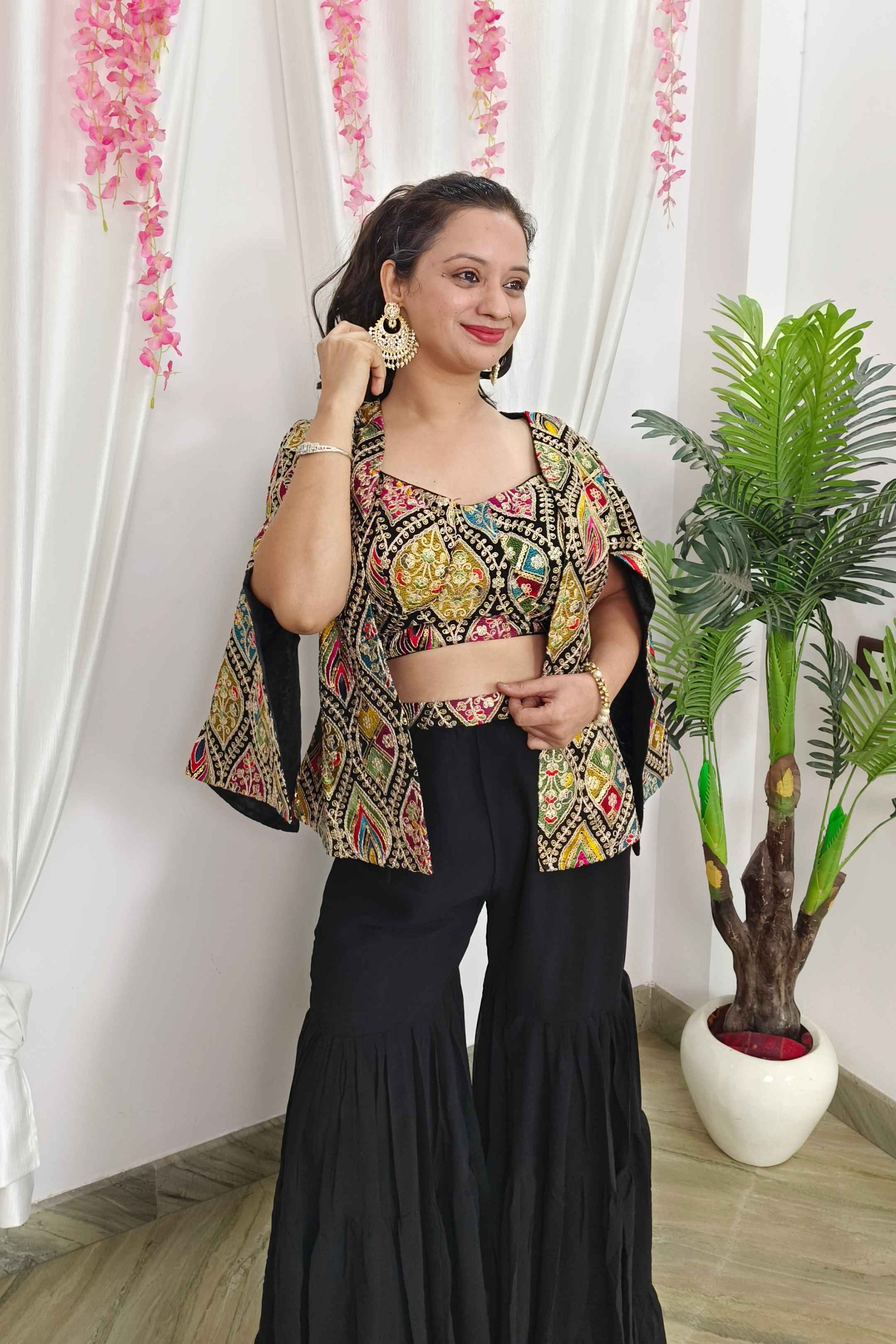 Noodle Strap Crop Top With Flared Sharara With Multi Embroidered Separate Over Jacket