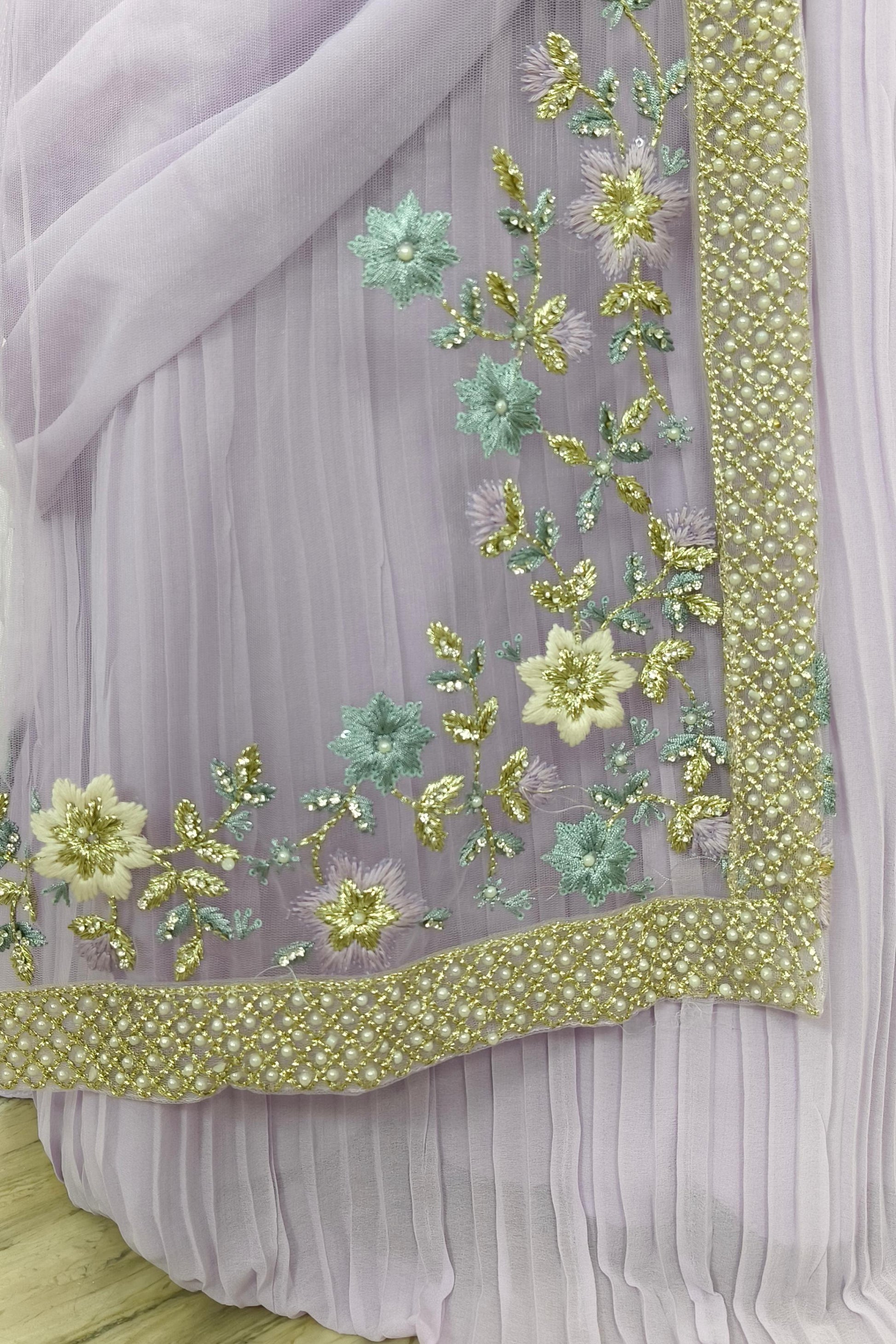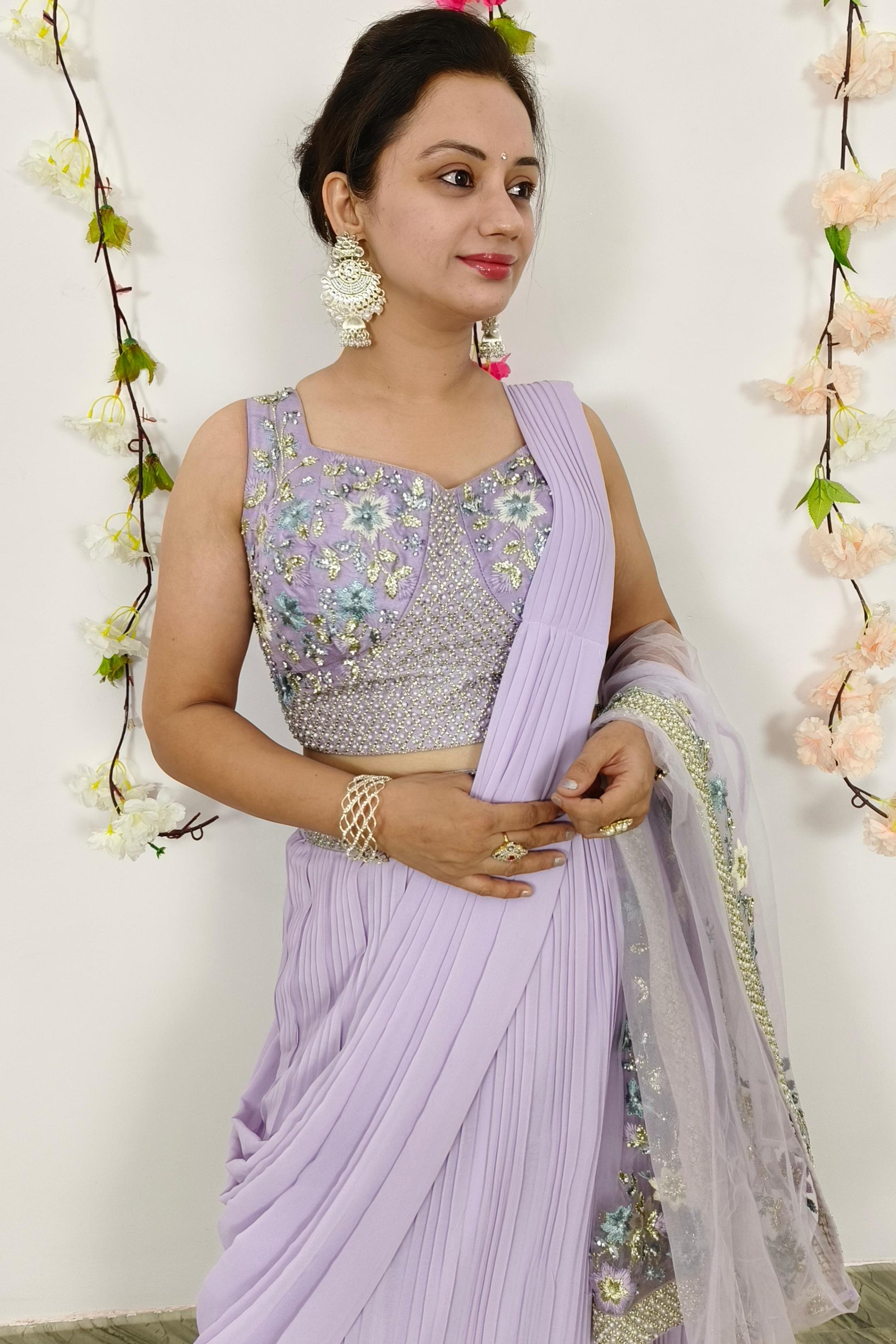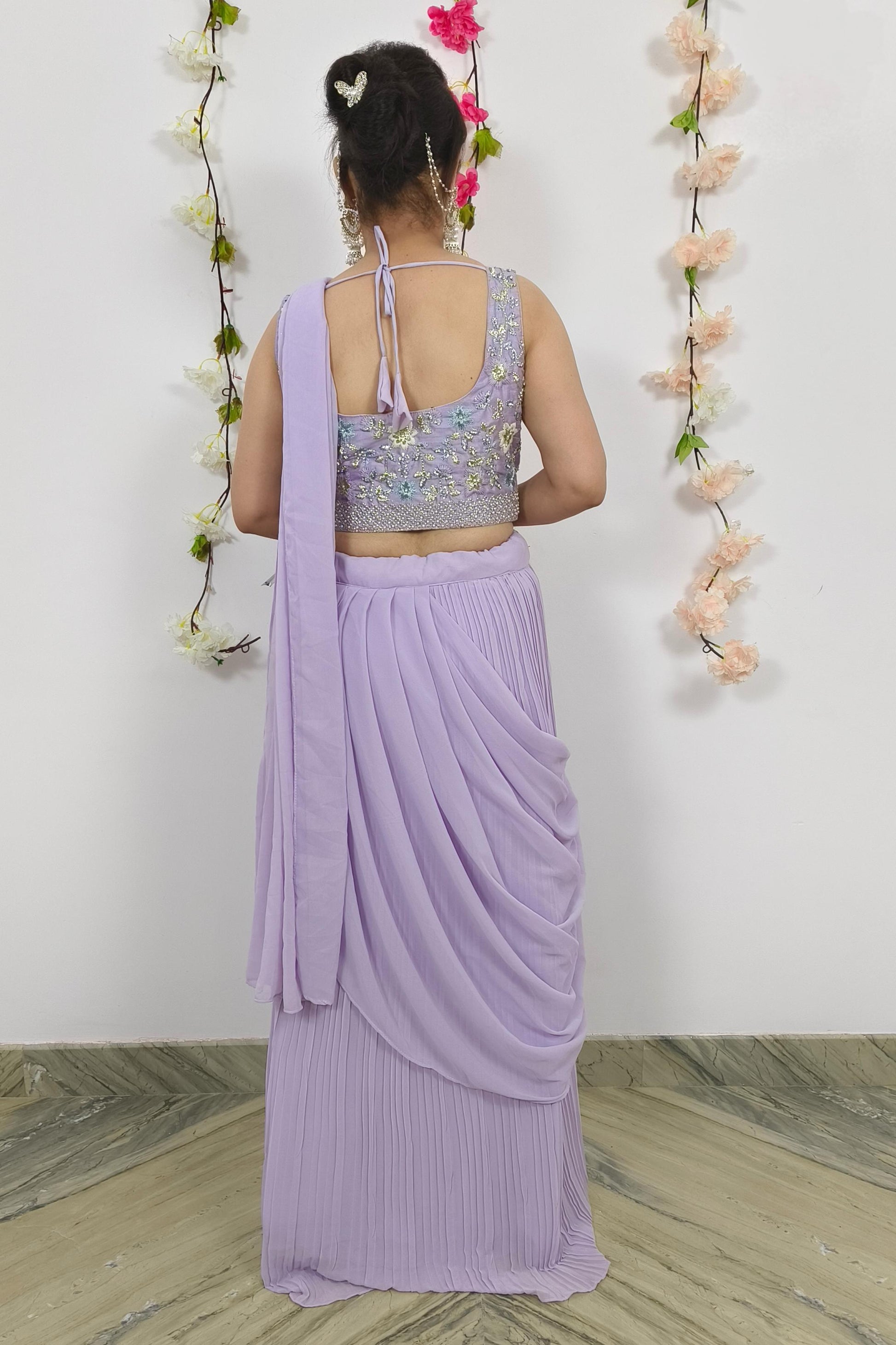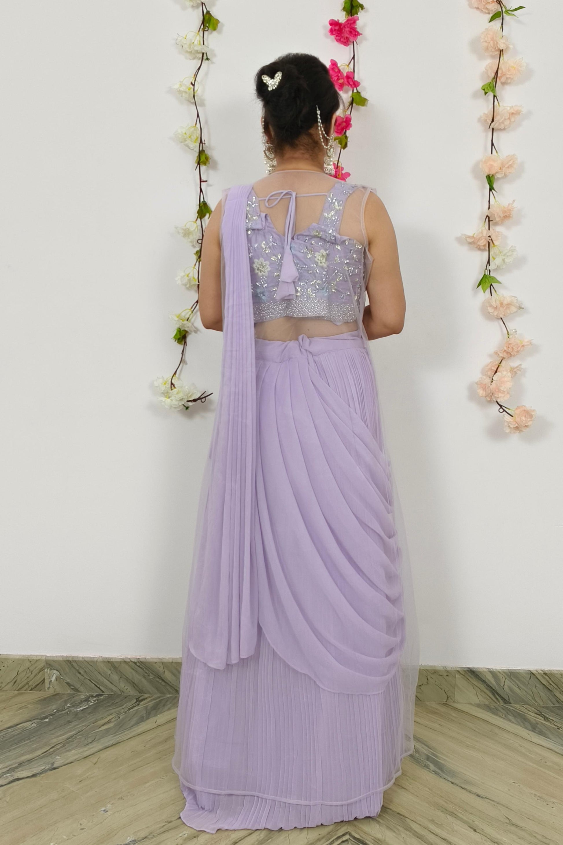 - Effortlessly Stylish Ensemble: This set includes a ready-to-wear drape dress with a skirt bottom, paired with an embroidered overshrug in elegant lavender.