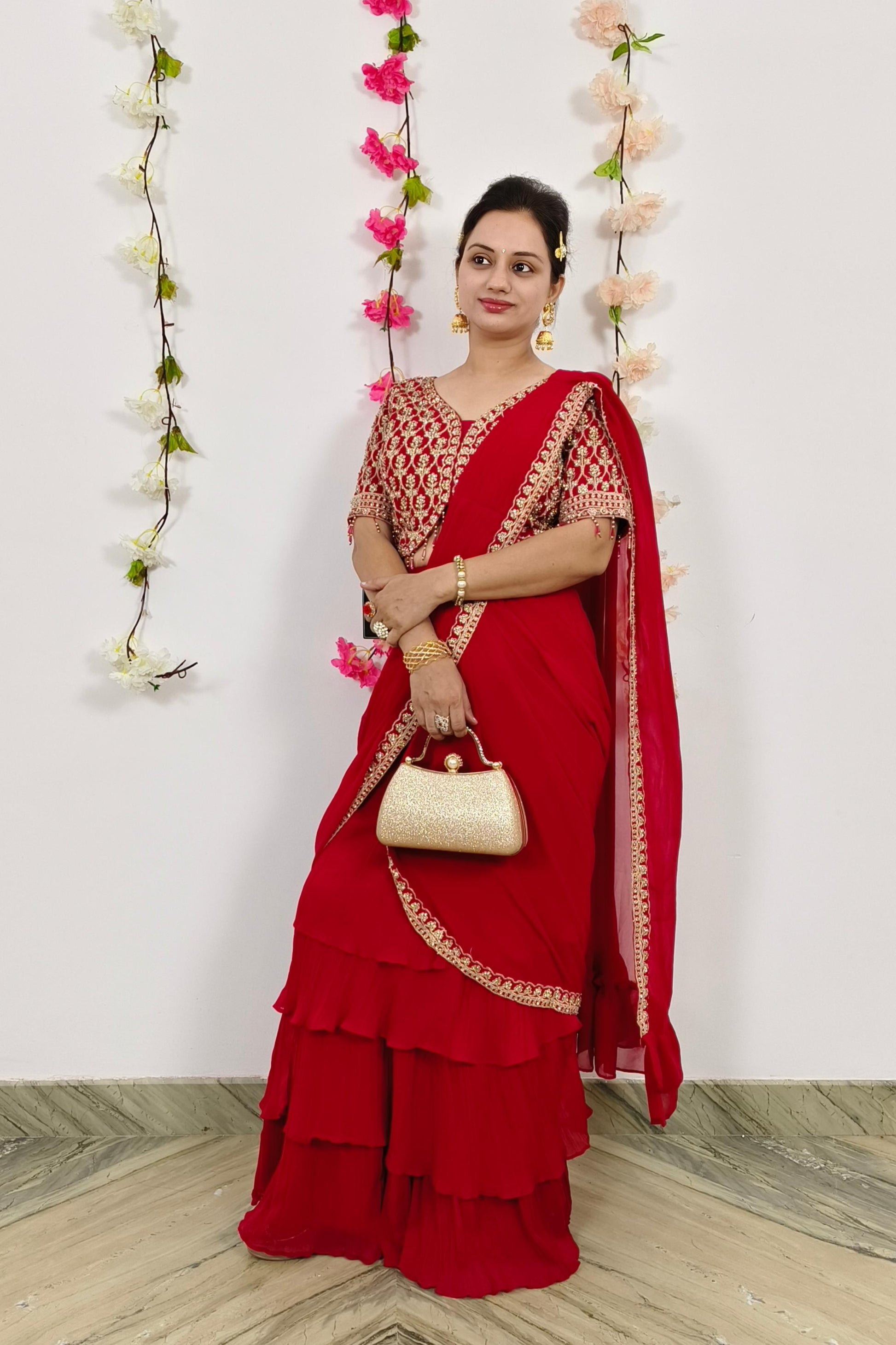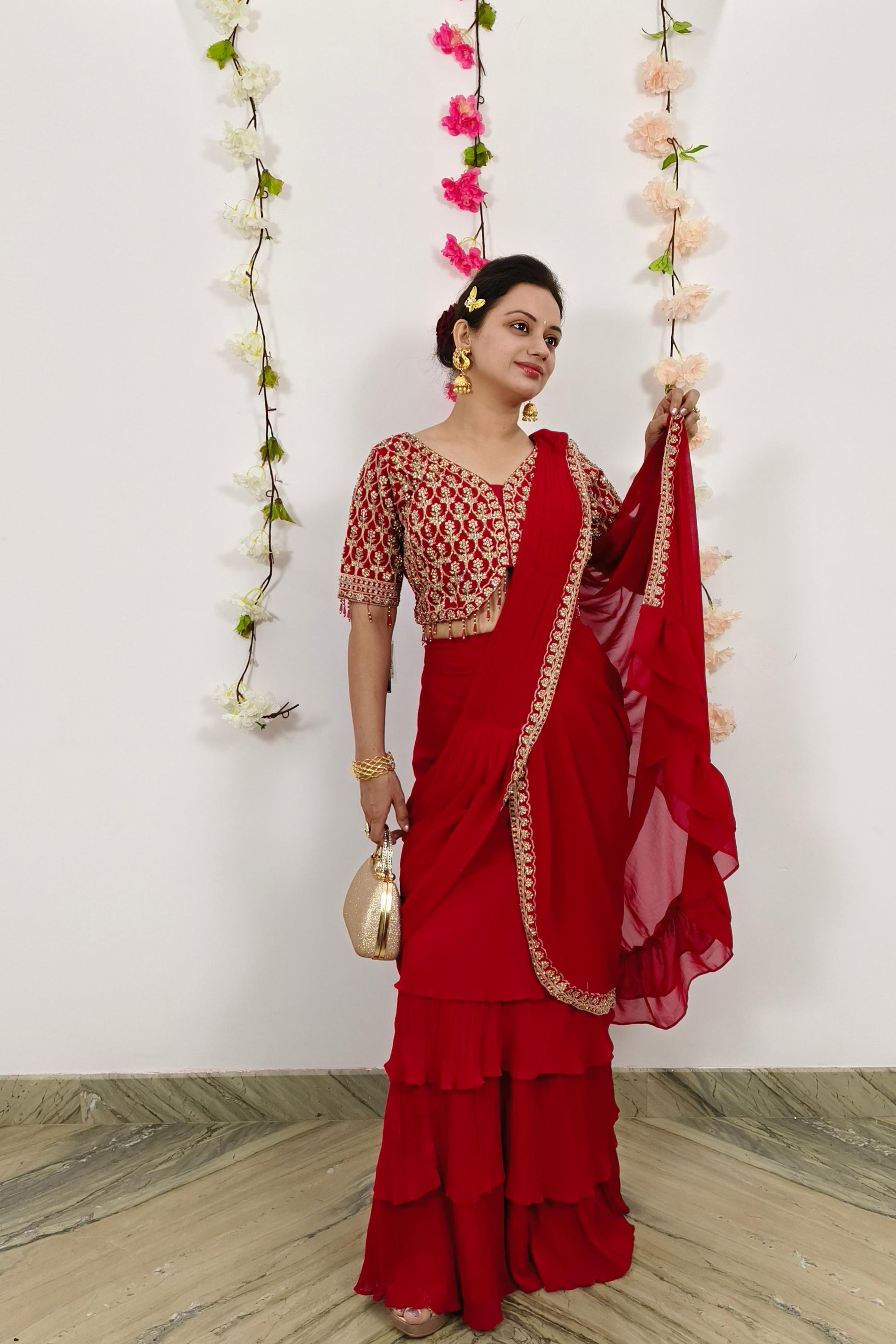 - Effortless Glamour: This ensemble features a ready-to-wear georgette drape saree paired with a hand-worked blouse in stunning red, exuding effortless glamour.