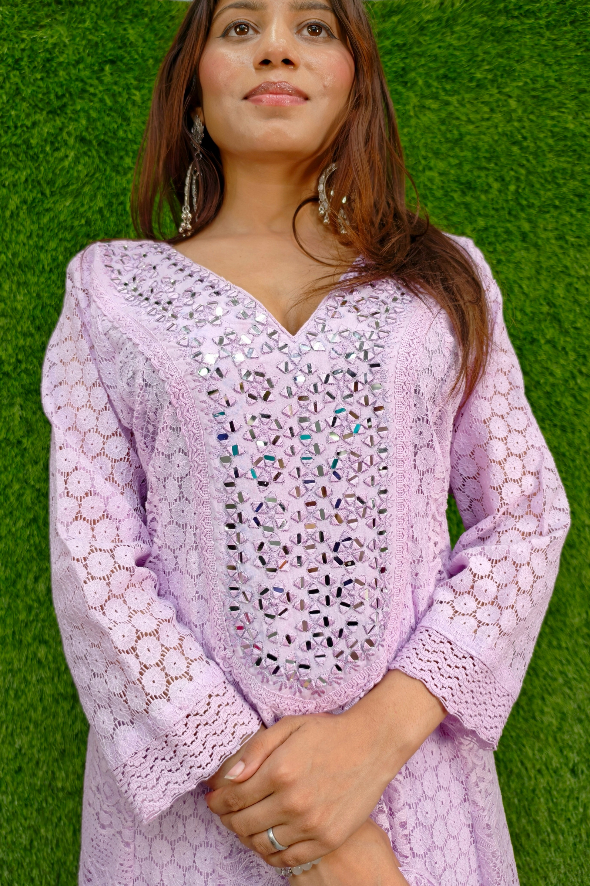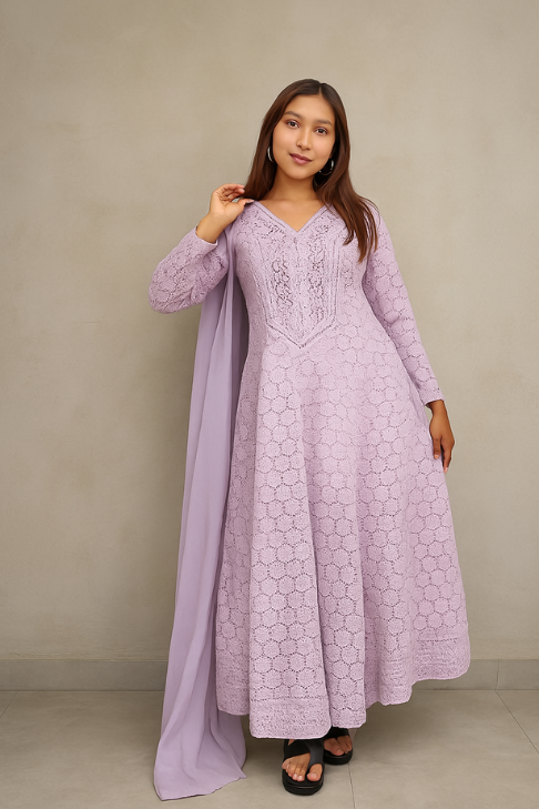 - Design: Schiffli work Anarkali kurta with beautiful mirror work neckline embroidery with chiffon dupatta