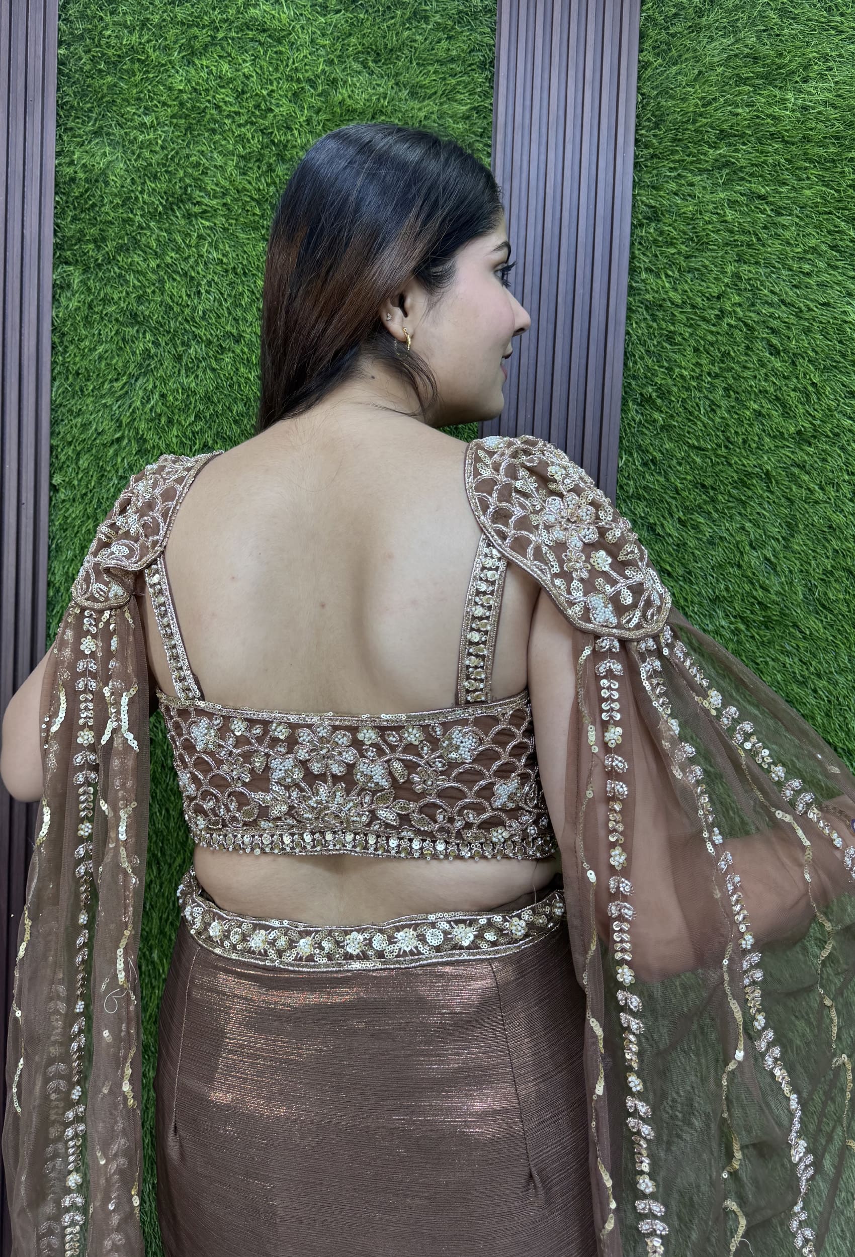 The outfit features a stunning hand-worked crop top blouse, intricately embellished to add a touch of luxury and finesse. The highlight of the ensemble is its falling sleeves with cape on shoulder design, offering a dramatic and fashion-forward appeal.