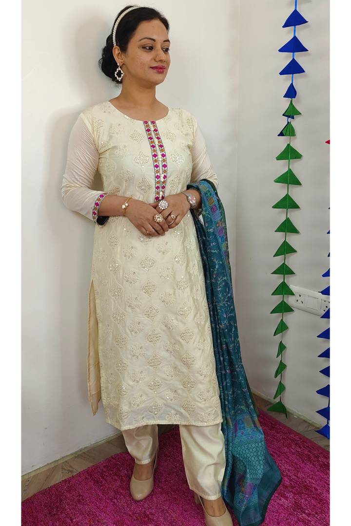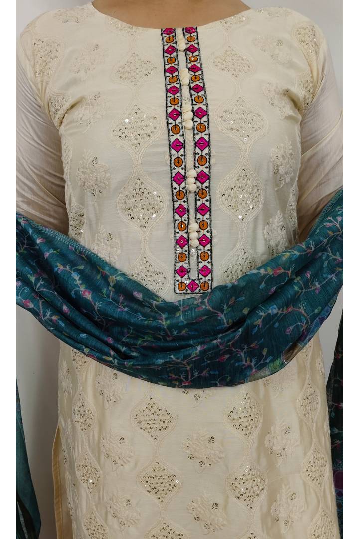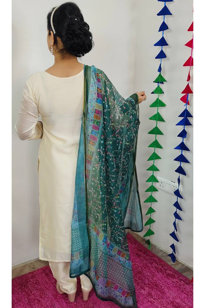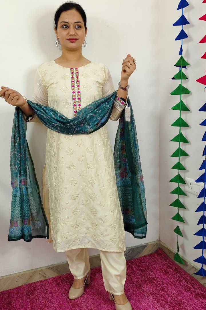 Straight ThreadWork Embroidered Kurta Set with Organza Printed Duppatta